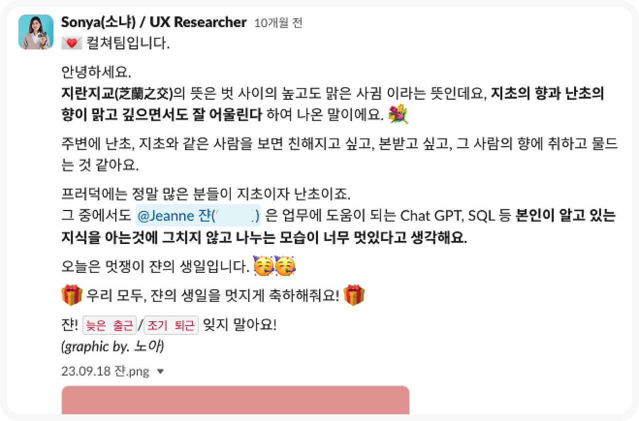 생일 축하를 하기 위해서는 나도 생일자에 대해 잘 알고 있어야 한다. 그래서 생일이 가까워지는 사람이 있다면 은근 주변을 기웃거리며 말을 걸어보거나, 가까운 다른 팀원에게 몰래 당사에 대한 정보를 얻기도 했다. 그 결과 생일 당사자가 감동하는 것은 물론, 메시지를 읽고 축하해 주는 사람들의 반응도 뜨거웠다. 또 어떤 사람은 나에게 본인 생일 날짜를 어필하며 메시지를 기대하기도 했다. 컬처팀을 마무리하는 시점에선 나의 생일 축하를 받지 못한 동료들은 뭇매 아쉬움을 내비쳤다. (나도 아쉽다. 컬처팀 인수인계를 하며 내심 아쉬웠다.)