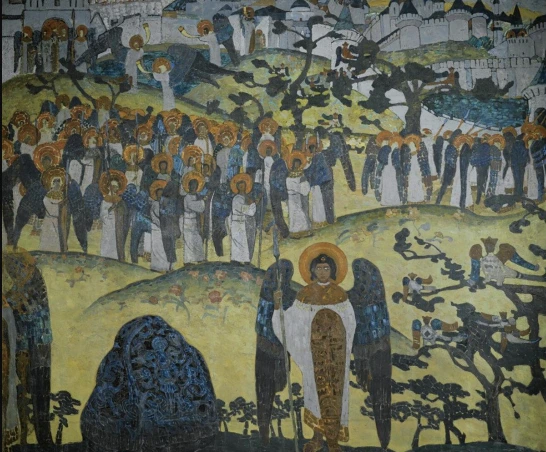 아래 1905년 천사의 보물은 이러한 정신의 연장 선상에서 그린 것이라고 한다. 종교에 대한 그림이다. 몸이 새고 형상은 인간인 천사들은 러시아 고전 전래동화에서 온 것이다. 그리고 뒤에 보이는 건물들은 14-15세기 건축물들로, 고대의 정신과 영적인 통합을 담고자 한 작가의 의도가 느껴진다.