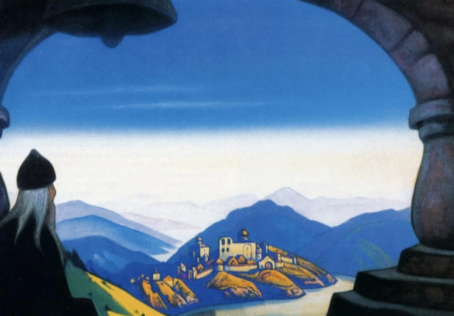 선지자가 어떤 슬라빅 마을을 보고, 이 땅에 대해 알고 싶다고 생각하는 장면이라 한다. 히말라야 풍경같은데 또 사원들을 보면 새로운 마을이 슬라빅 마을같다. 동시에 끝없이 보이는 산들이 동화적인 분위기를 자아낸다.