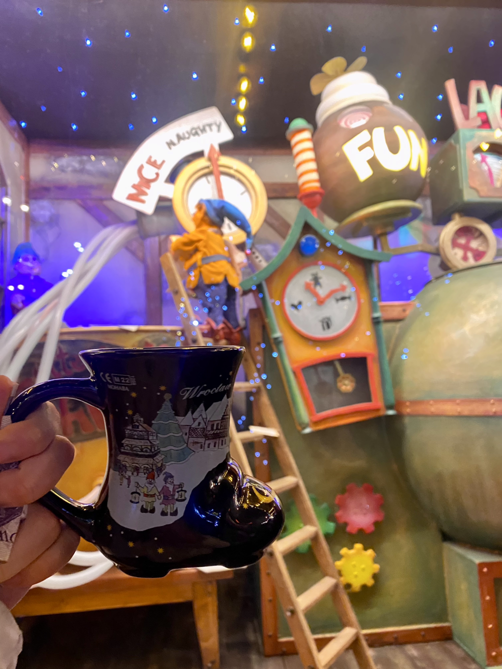 대부분의 크리스마스 마켓은 매년 크리스마스 기념 컵을 판매한다. 브로츠와프 크리스마스 마켓도 마찬가지였는데 '난쟁이의 도시'라는 수식어에 맞게 난쟁이가 튀어나올 것 같은 신발 모양의 컵을 팔고 있었다. 다들 손에 컵 하나씩 들고 와인을 마시고 있는 모습이 웃기면서도 귀여웠다. 나와 친구들도 하나씩 사서 반짝반짝 빛나고 있는 크리스마스 마켓을 안주삼아 함께 와인을 마셨다.