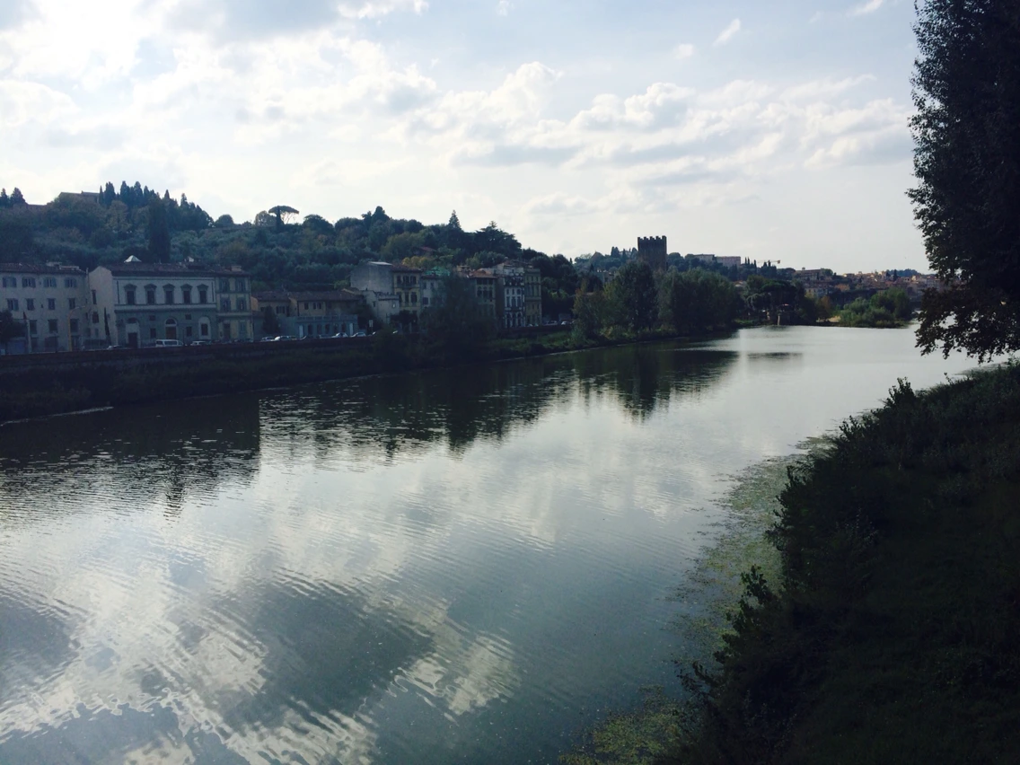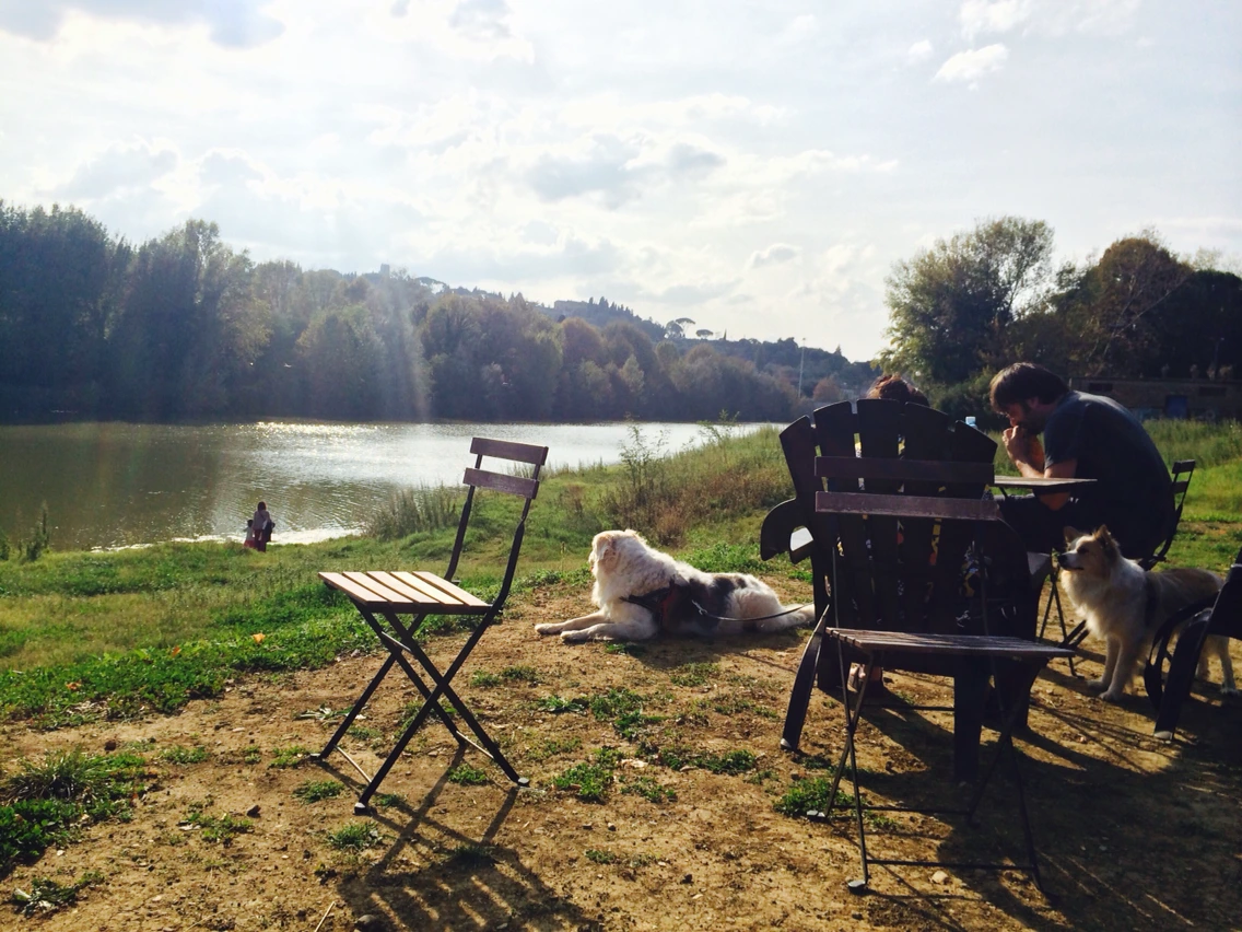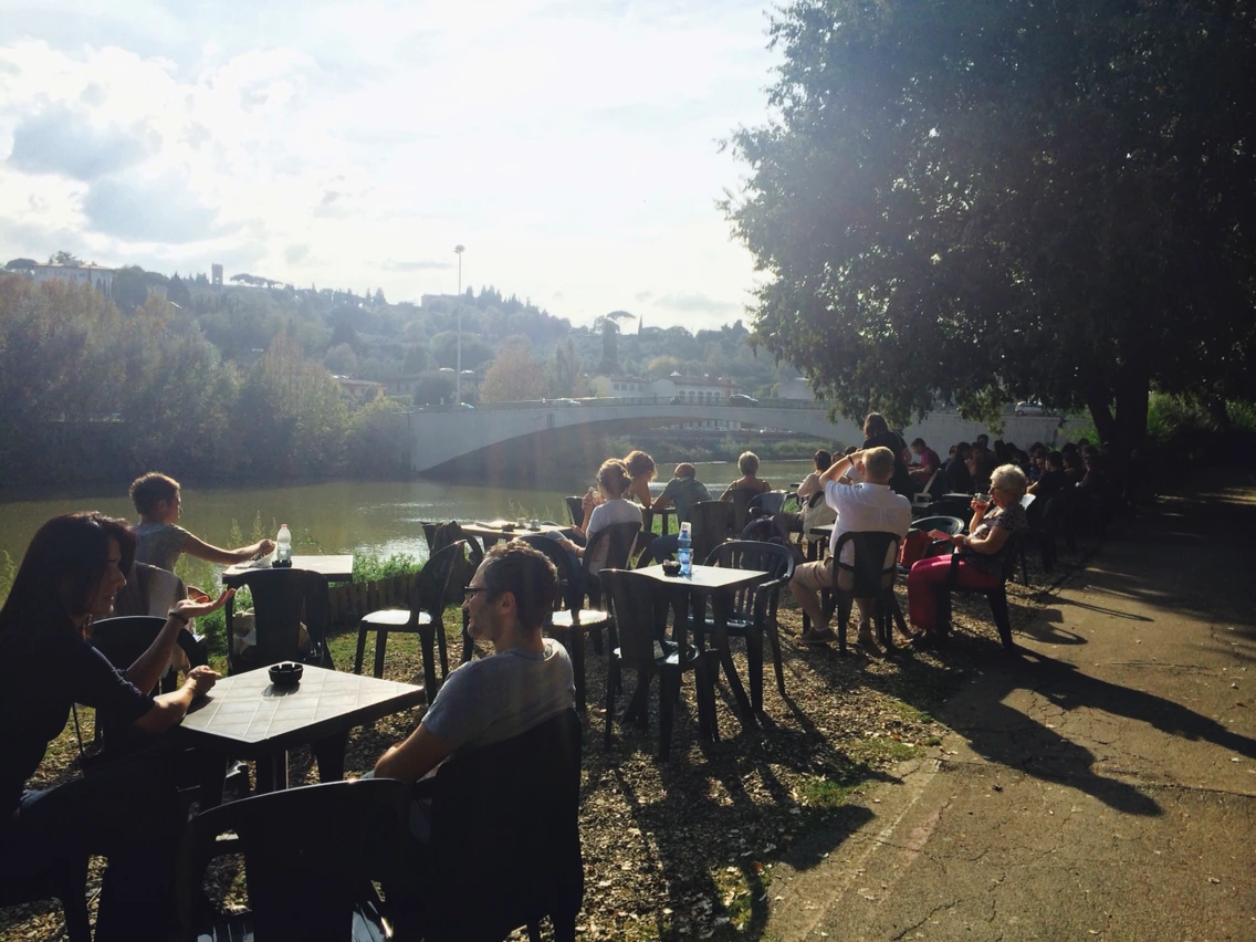 아르노강을 따라 미켈란젤로 광장으로 향하던 길, 강둑 풀밭에 의자와 테이블을 아무렇게나 펼쳐놓고 햄버거를 파는 푸드트럭을 발견했다. 슬그머니 한 자리를 차지하고 앉았다. 그늘 한 점 없어 땡볕에 일광욕하는 수준의 뜨거움이었다. 열 명 남짓의 사람들이 버거와 프렌치프라이를 앞에 두고 초록빛으로 빛나는 강과 파란 하늘을 멍하니 바라보고 있었다.