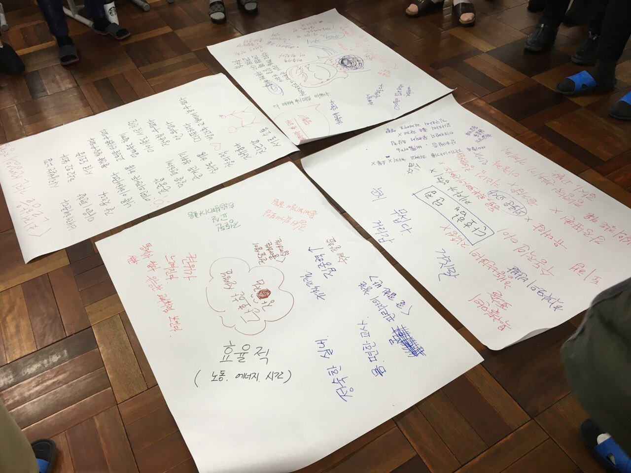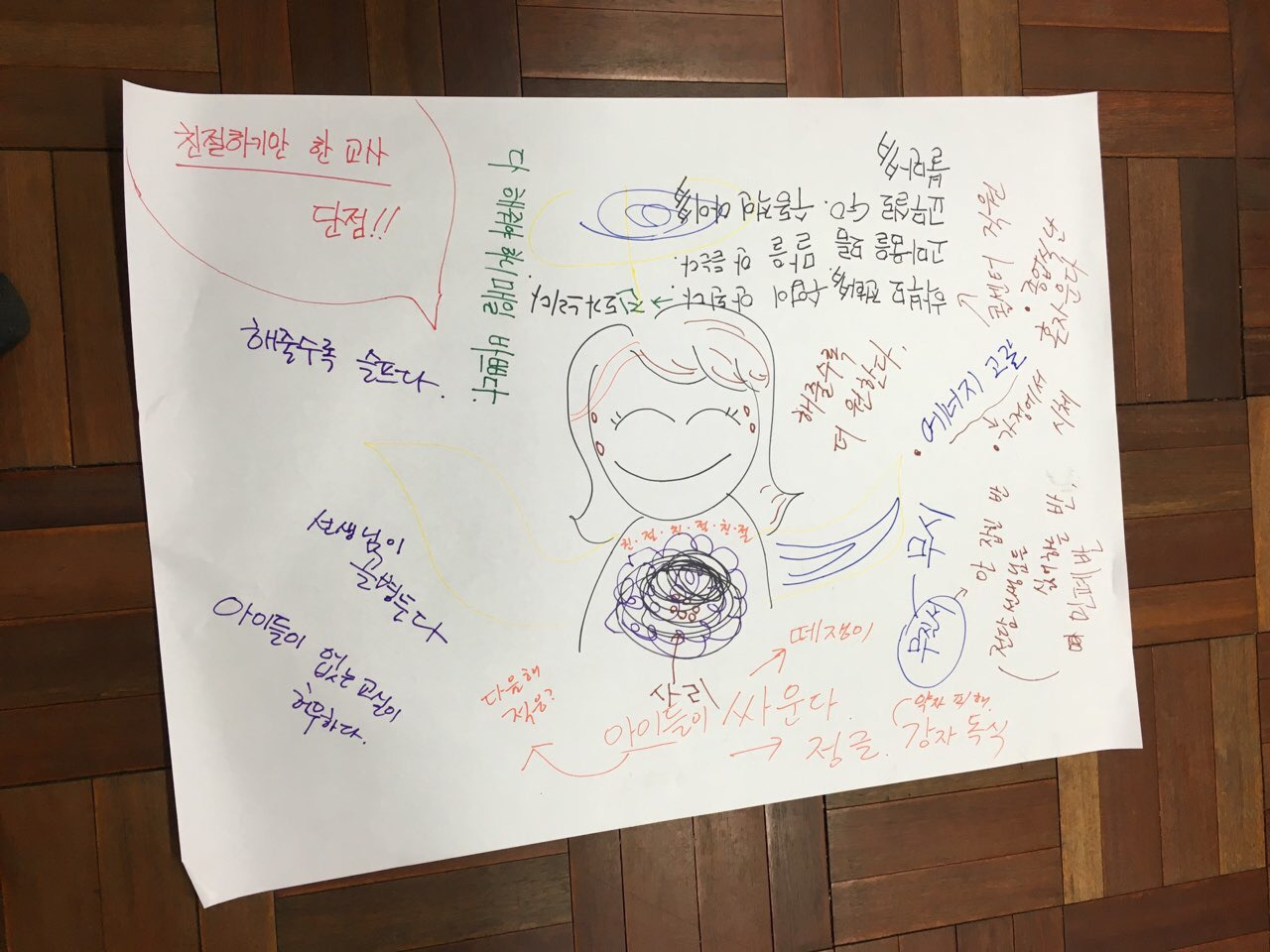 연수 내용을 어떻게 배우기보다 강사 선생님께서 판을 벌려주시면 우리끼리 대화하고 방법을 찾아가는 연수 방법이다. 이런 연수가 좋다.