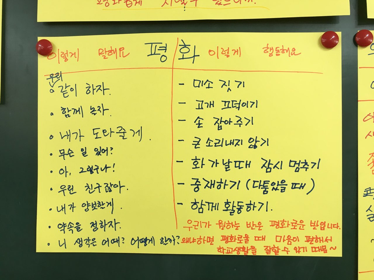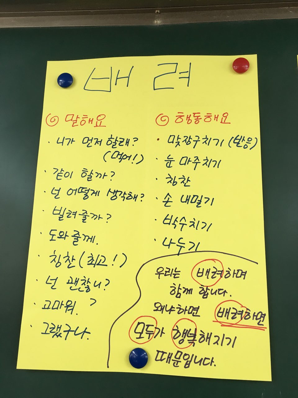 2. 포스트잇에 나온 것을 배려, 존중, 우정, 즐거움, 소통 따위의 키워드로 정리한다.