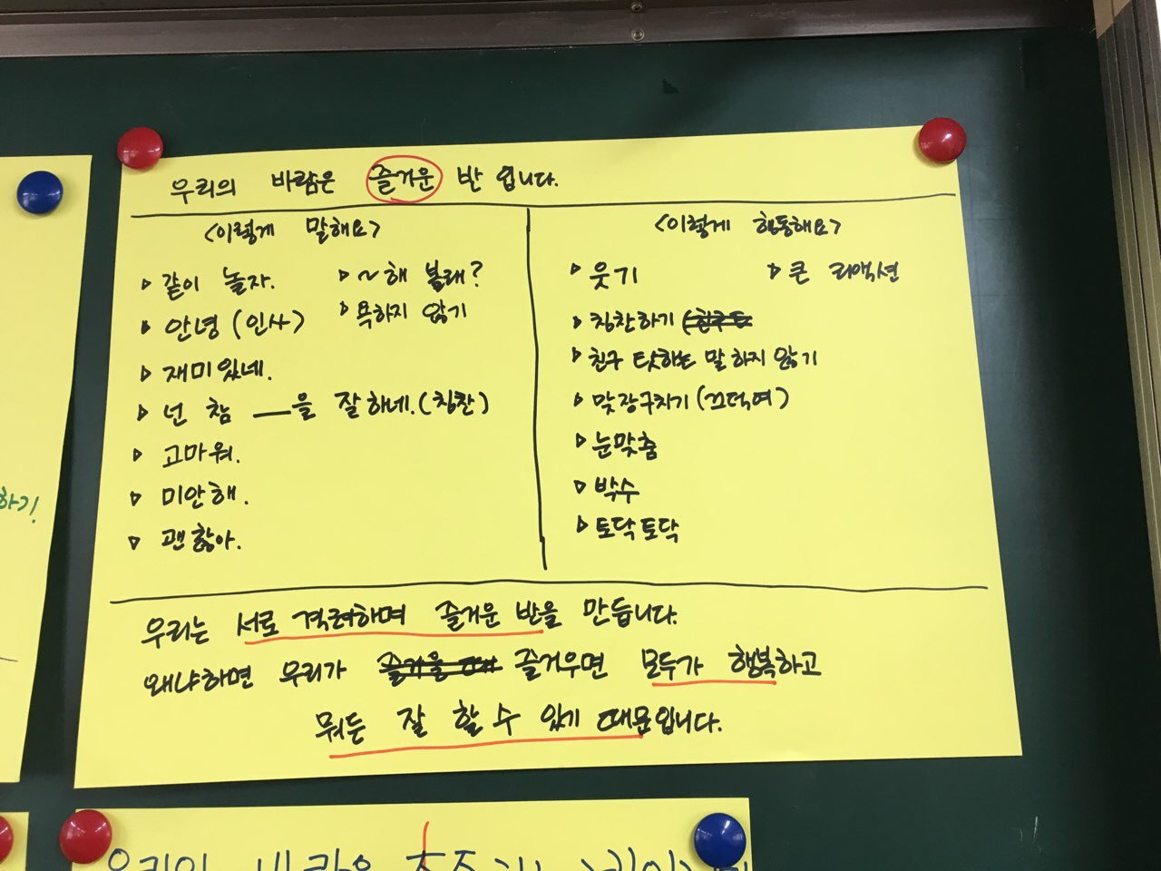 하나의 키워드마다 발표가 끝나면 동의(위로 따봉), 수정(옆으로 따봉), 반대(아래로 따봉)를 하게 하고 모든 학생들이 만족할만한 키워드를 만든다. (이게 중요한데 이 따봉이 너희들이 일 년 내내 지킨다고 약속했지? 너희들도 인정한 거다?라는 늬양스를 줘야 한다. 스스로 만든 규칙이라는 느낌을 팍팍 줘야 한다... "스스로 약속 해 놓고 왜 지키지 않습니까?"라고 할 수 있도록...... 흐흐흐)