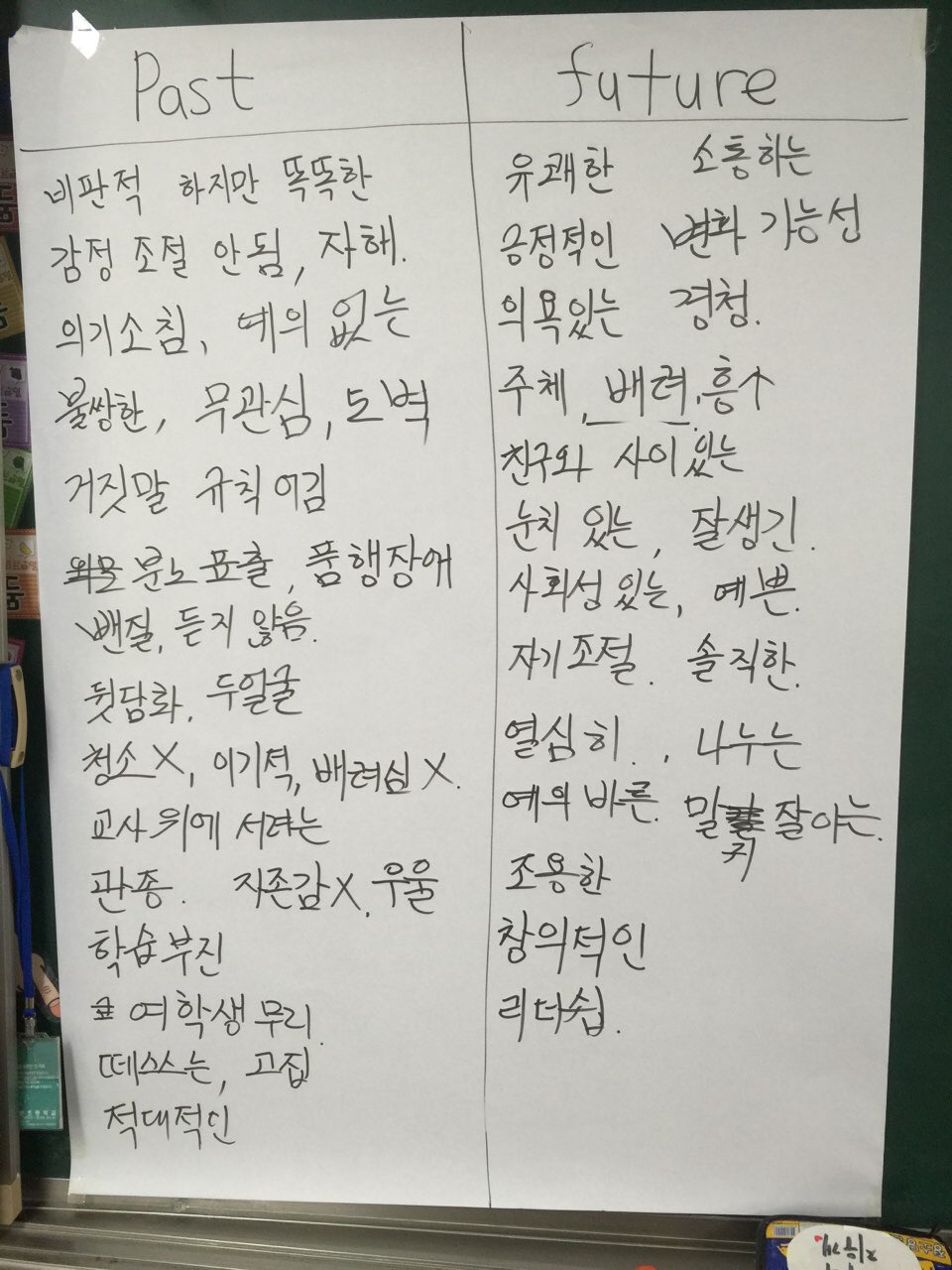 전지에 past(힘들었던 학생), future(원하는 학생)을 발표하고, 적는다.