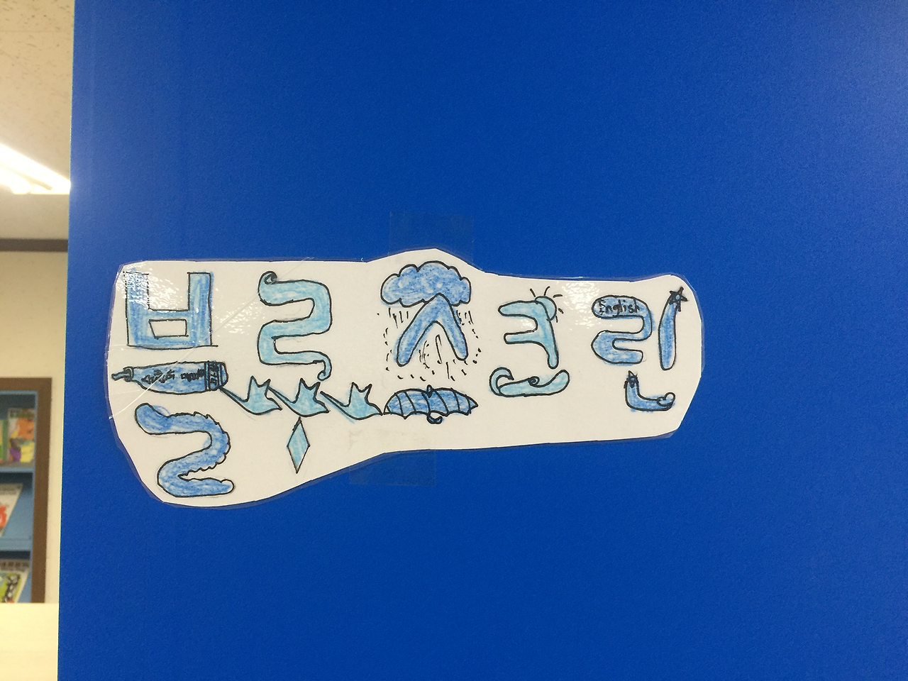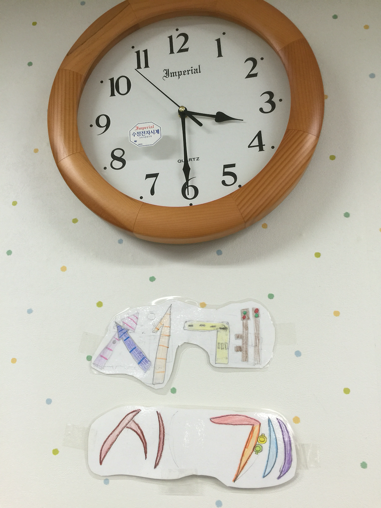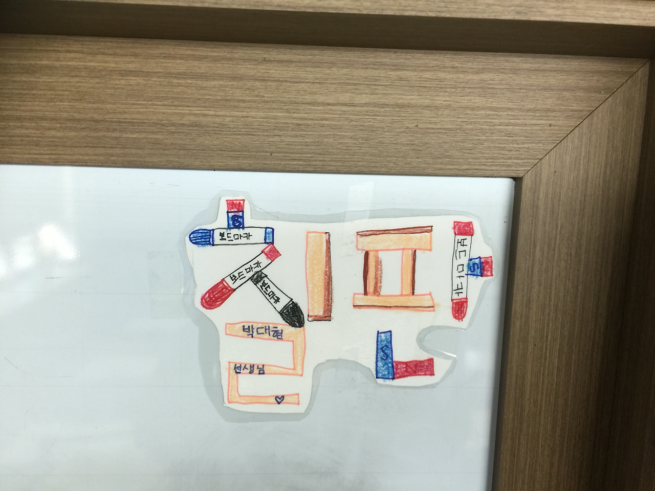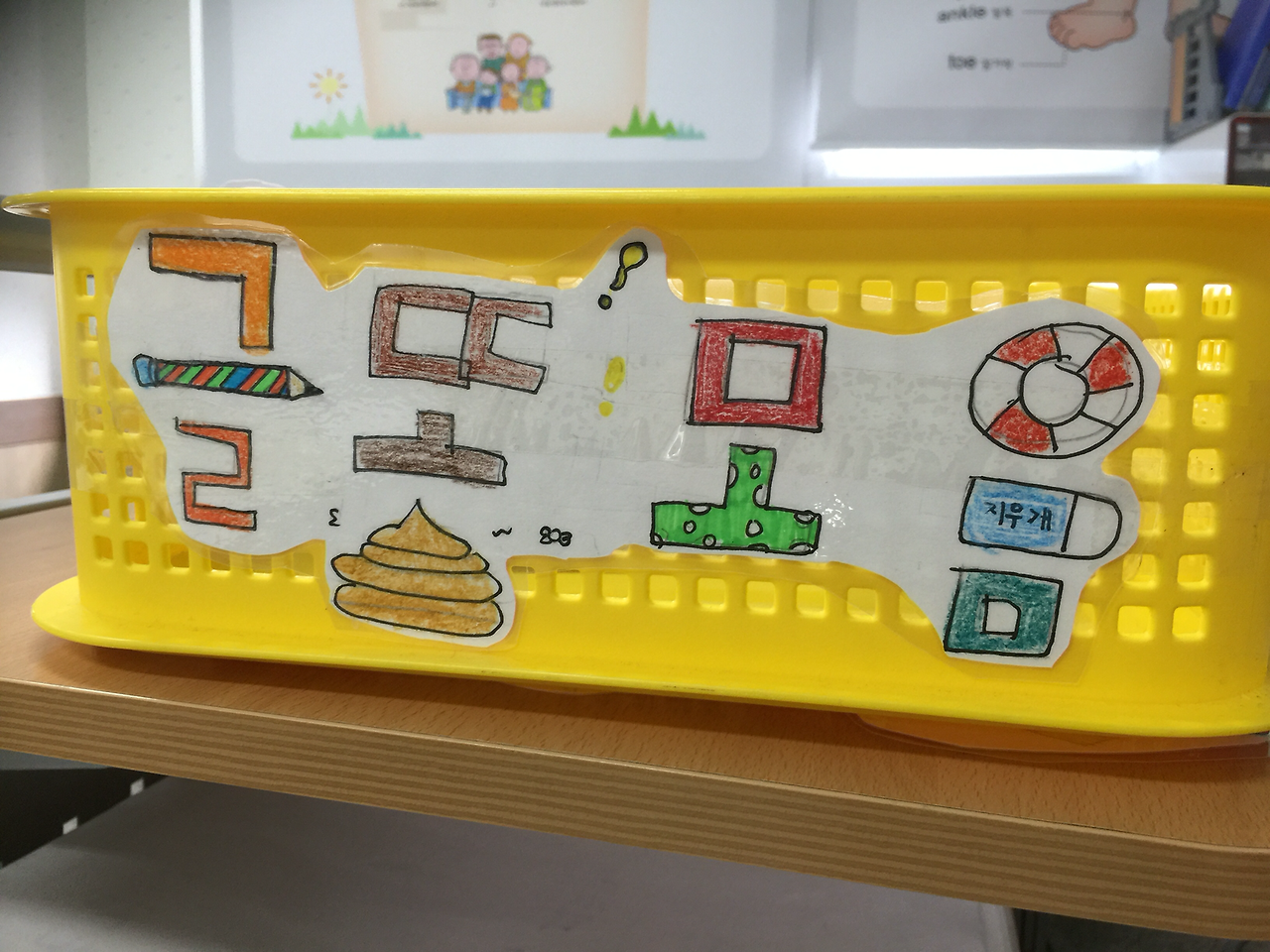 미술 시간에 만든 디자인 꾸미기를 코팅해서 겨실 곳곳에 붙였다
