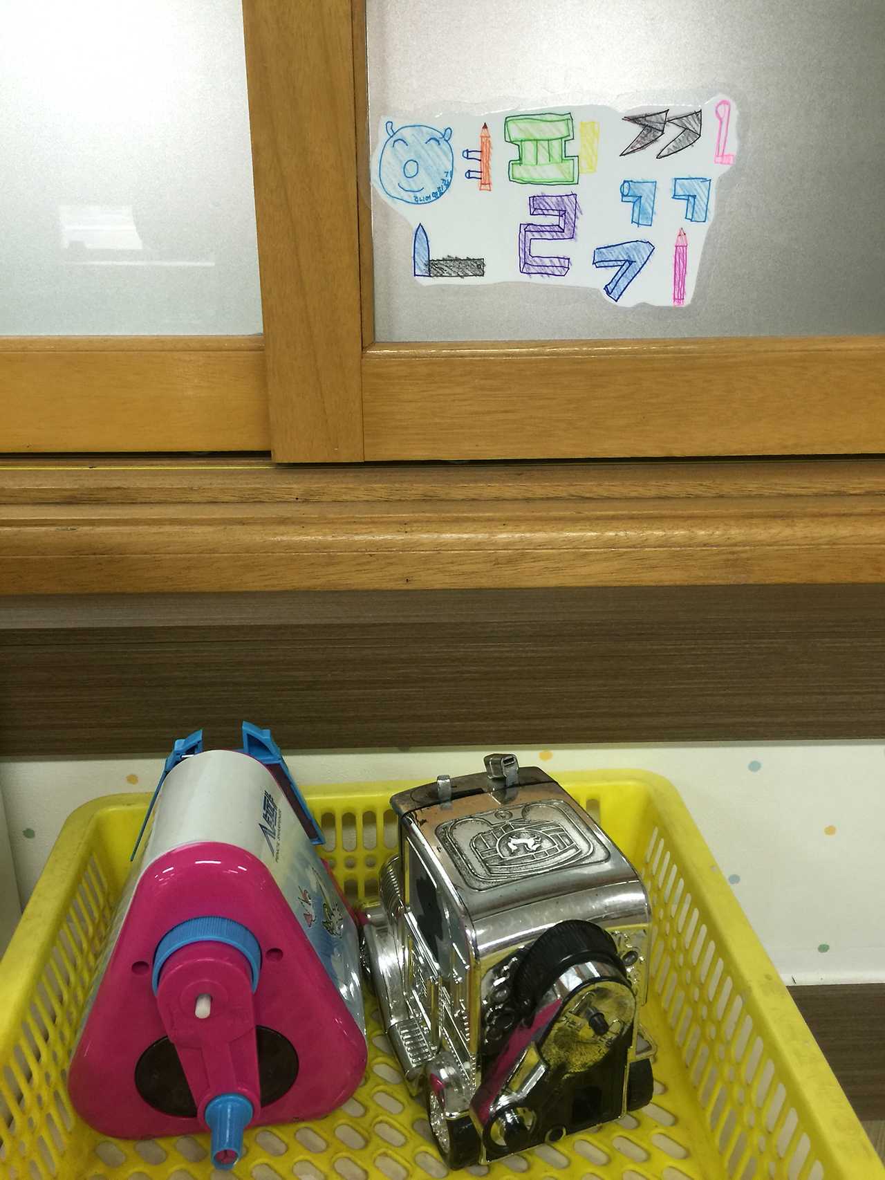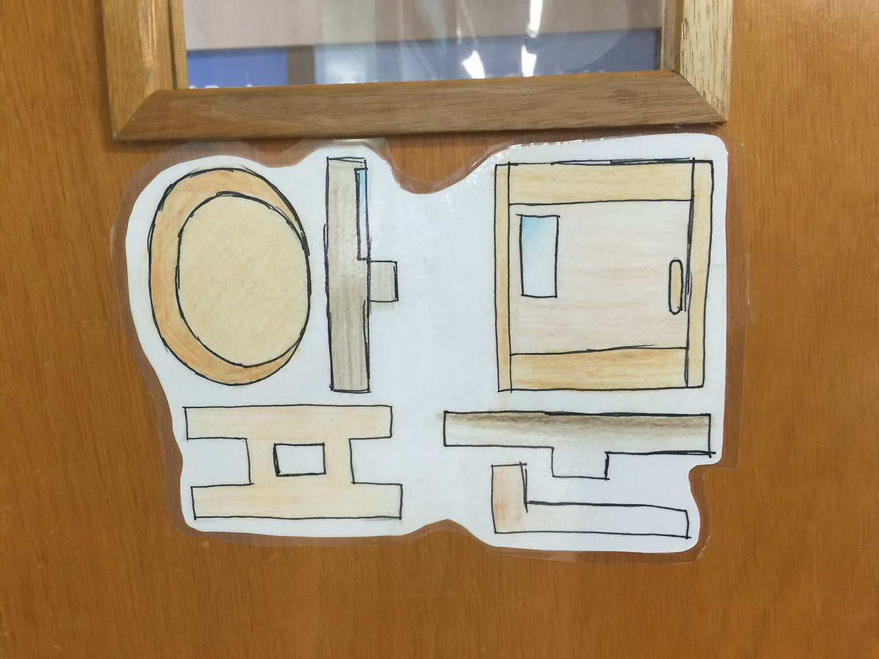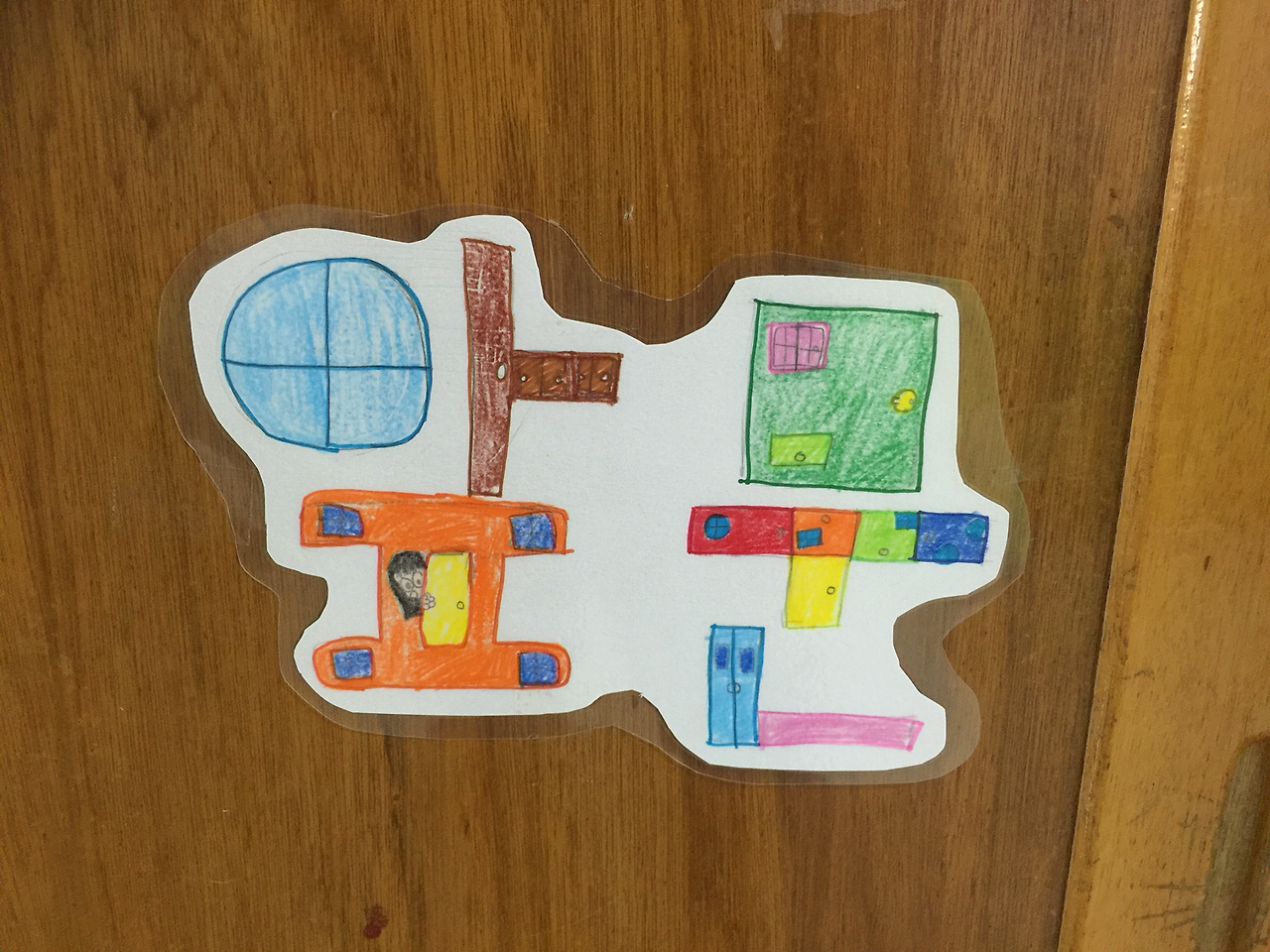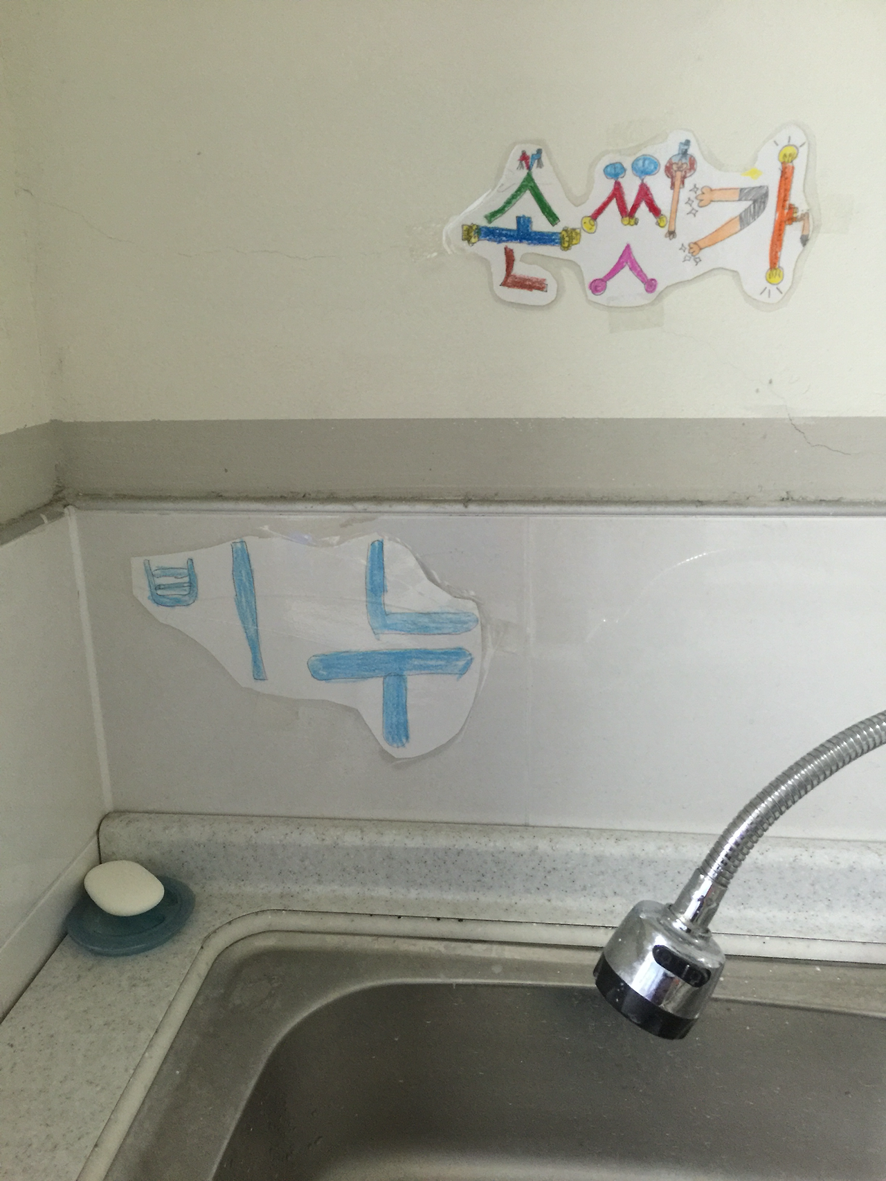 미술 시간에 만든 디자인 꾸미기를 코팅해서 겨실 곳곳에 붙였다