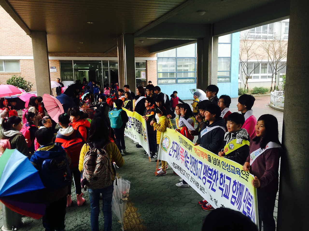 선생님들과 아이들이 모여 아이들이 주로 들어오는 입구에서 캠페인을 벌린다.