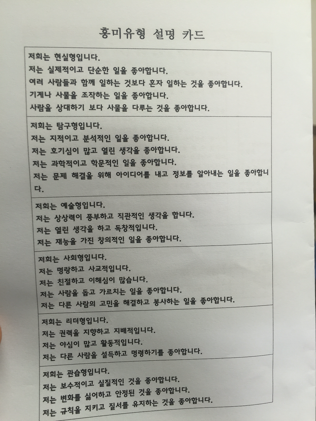 6가지 직업과 작업을 좋아하는 것과 싫어하는 것으로 나누고 자기의 적성을 찾아가는 활동이다.