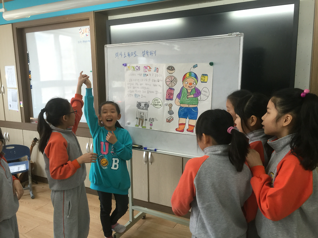 거의 반반이기에 뚱뚱 해진다에 2절지 2장을, 로봇이 된다에 2장을 주고 발표 자료를 만들도록 했다.