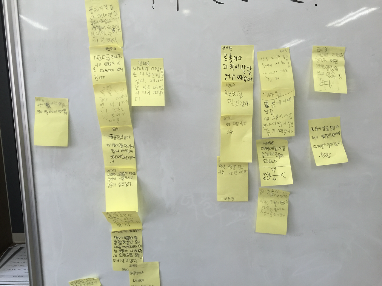 포스트잇을 활용해 개인의 생각을 묻고 비슷한 것들끼리 모은다.