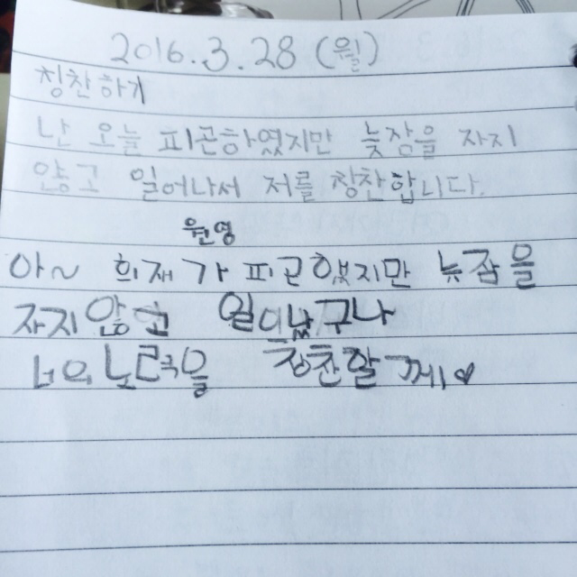 매주 돌아가며 한 번씩 스스로를 칭찬하고 격려하는 시간을 가지면 좋겠다.