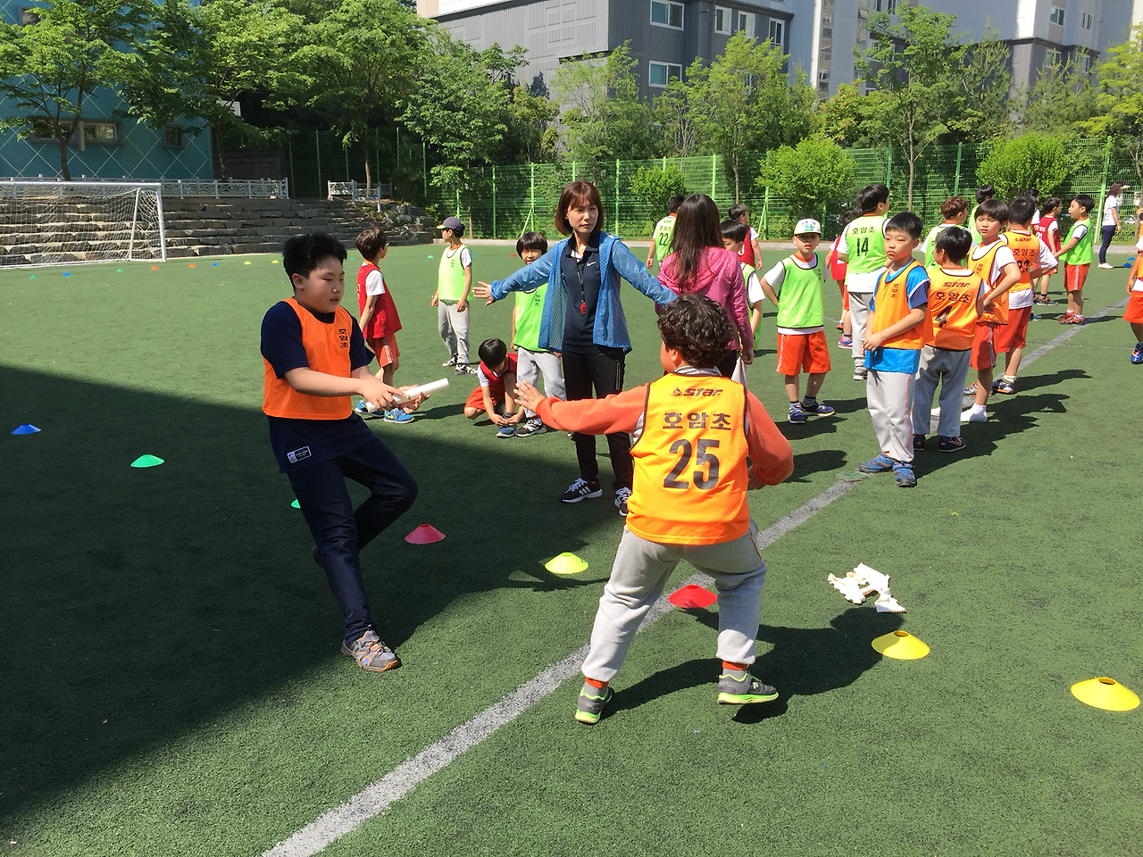 잘 뛰는 남학생이 뛰다 넘어졌는데 우리반 학생들이 모두 아쉬워 한다.