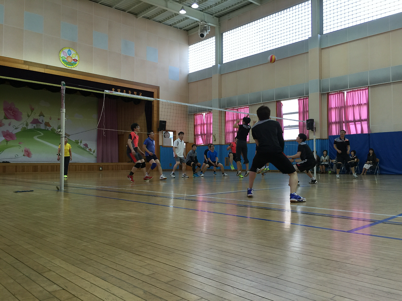 선생님들이 배구 연습을 하는데 나는 발목이 아파서 배구 연습을 하지 않는다.