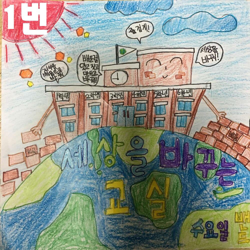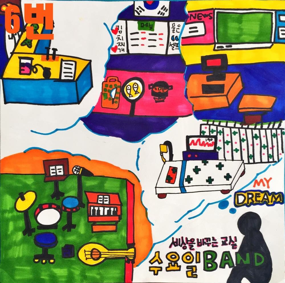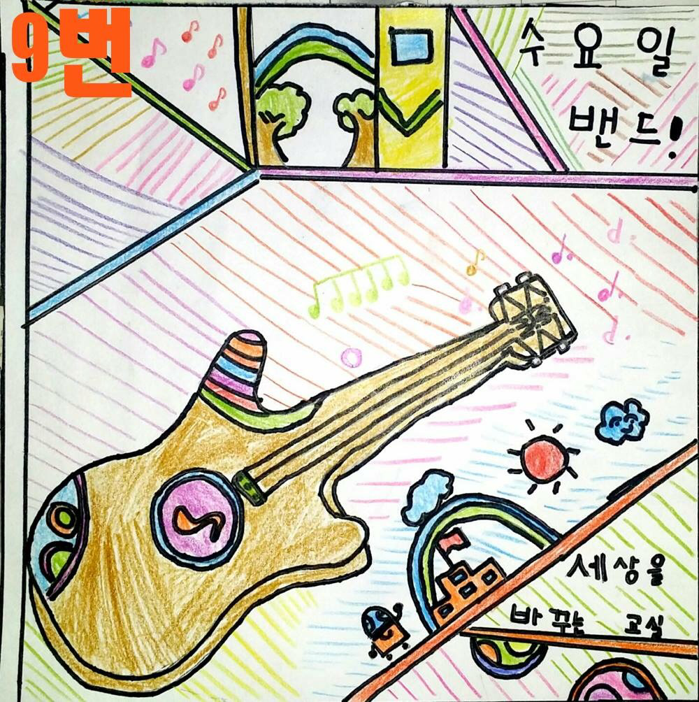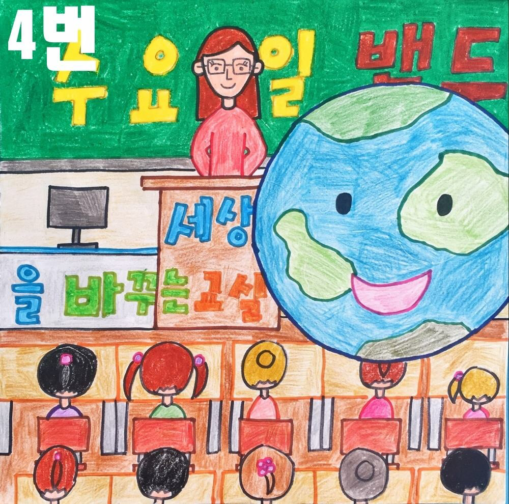 가장 표를 많이 받은 그림은 수요일밴드 새 앨범 "세상을 바꾸는 교실" 앨범 표지 그림으로 선정이 되고, 선정된 아이의 학급에서 파티파티 하실 수 있도록 케익 도넛 등등 10만원 상당의 기프티콘을 드려요!!(수뺀이 통 크게 쏩니다~)