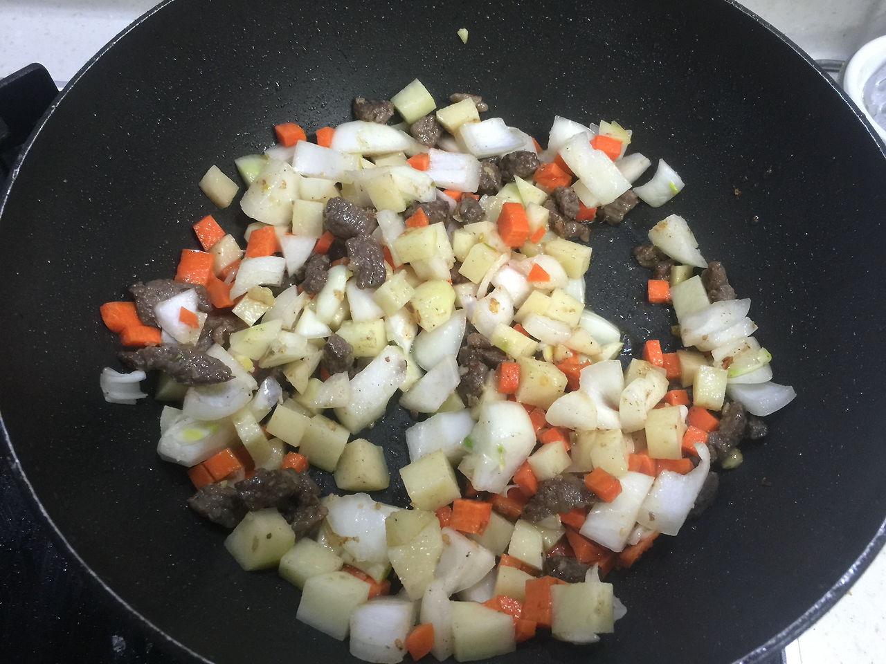 참기름에 고기 볶다가(다진 마늘, 후추, 소금 적당히) 고기가 반정도 익으면, 야채도 넣어 볶는다.