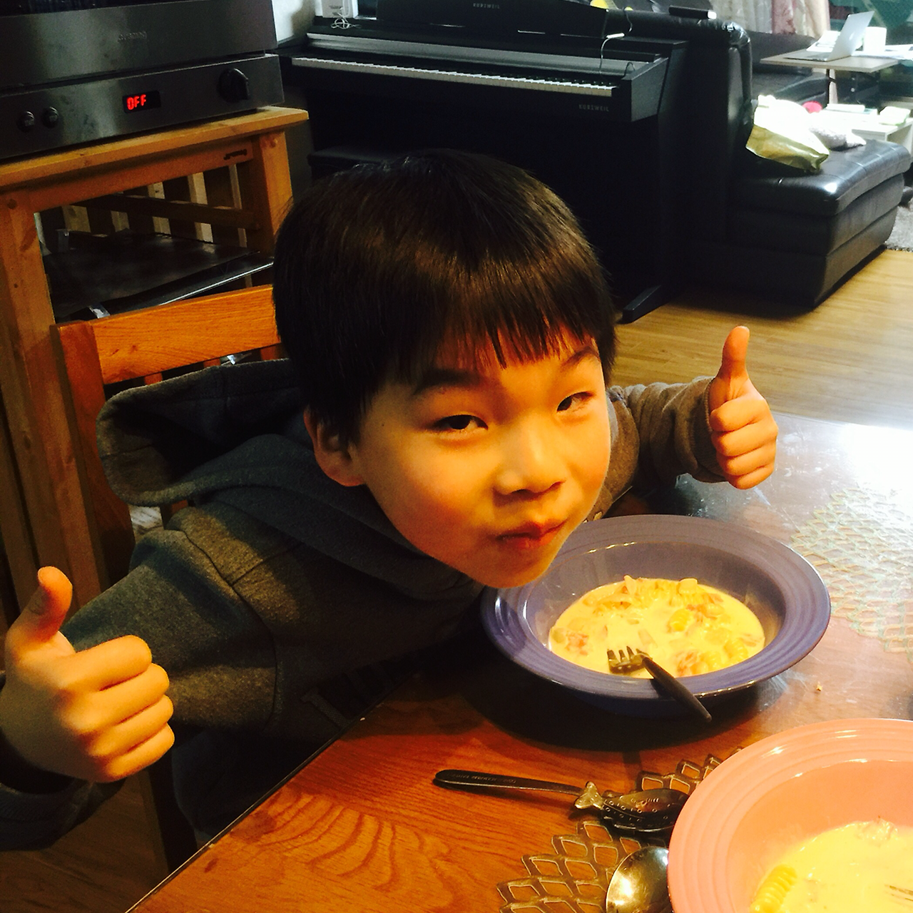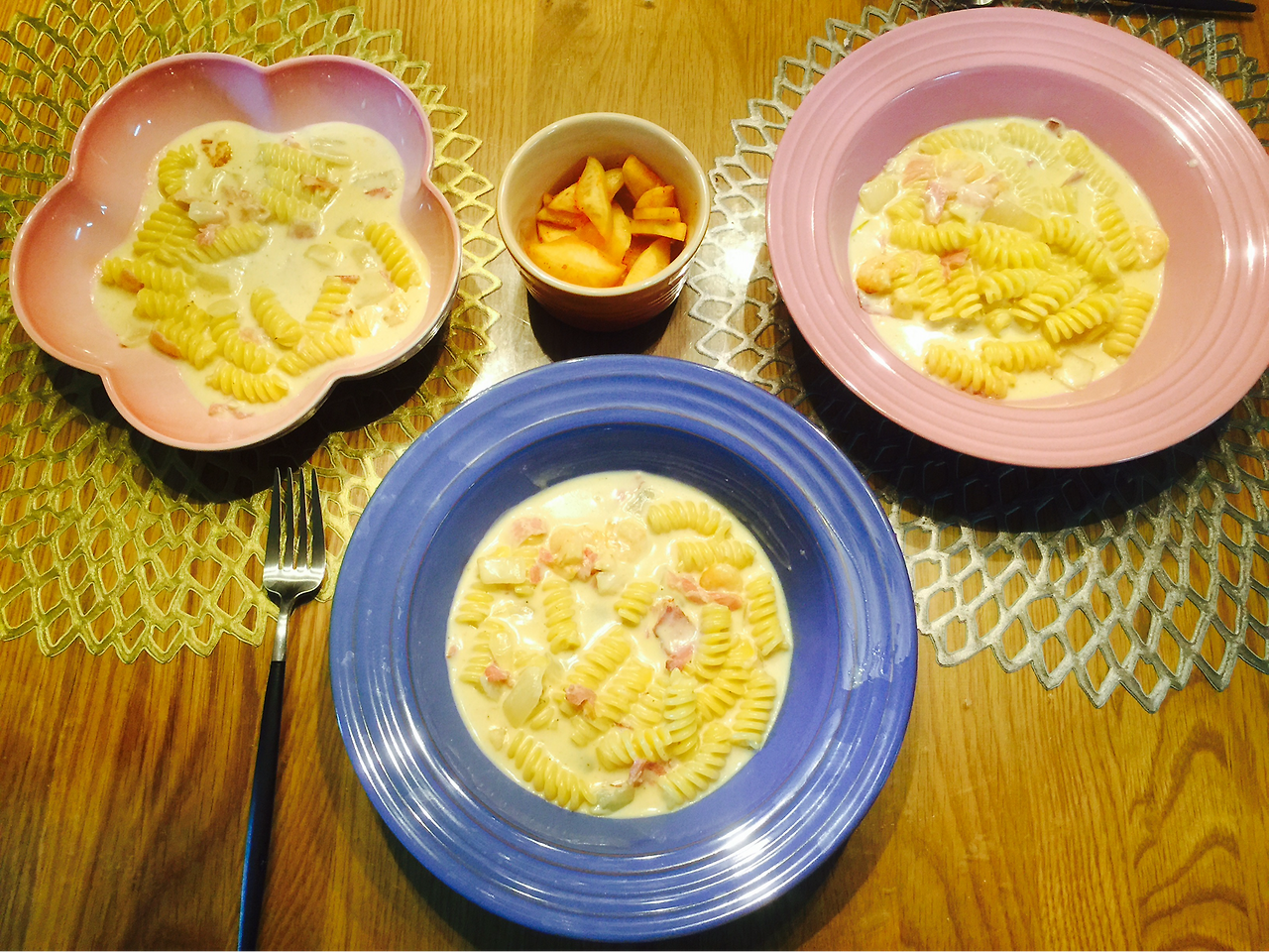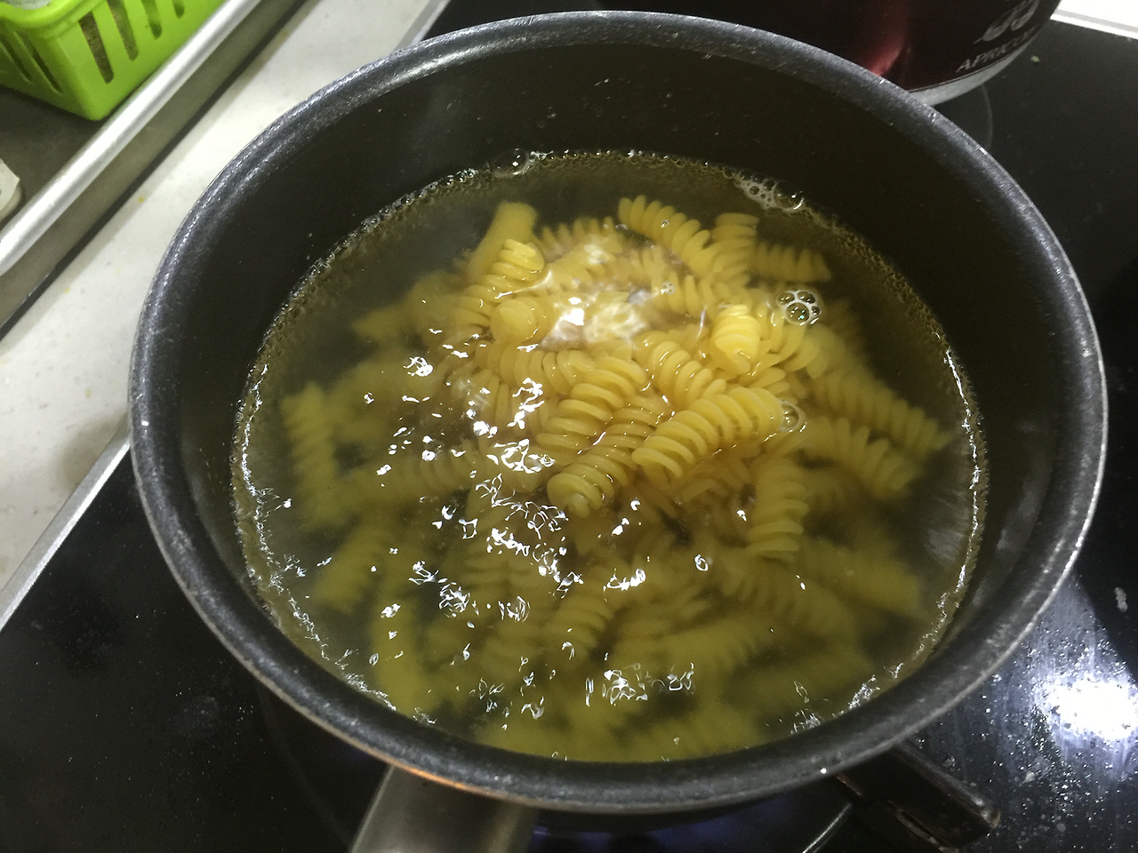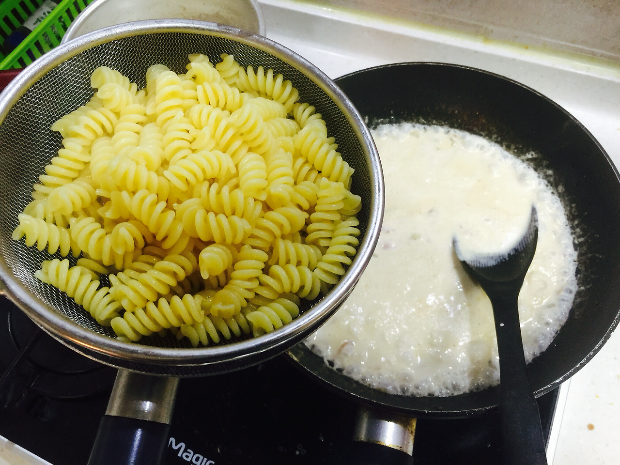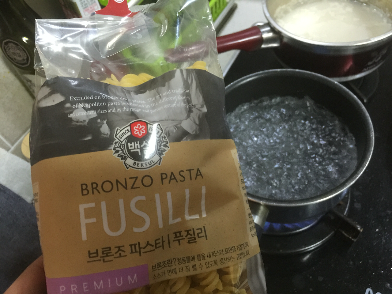푸질리 면, 크림파스타 소스, 올리브유, 냉장고 이것 저것(마늘 다진 것, 새우, 베이컨, 양파 등)