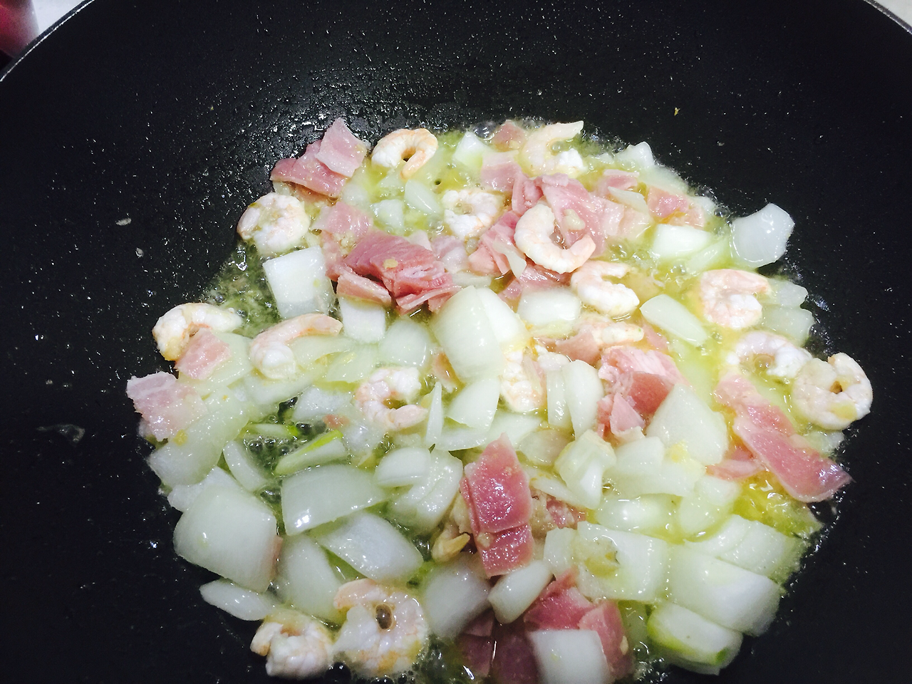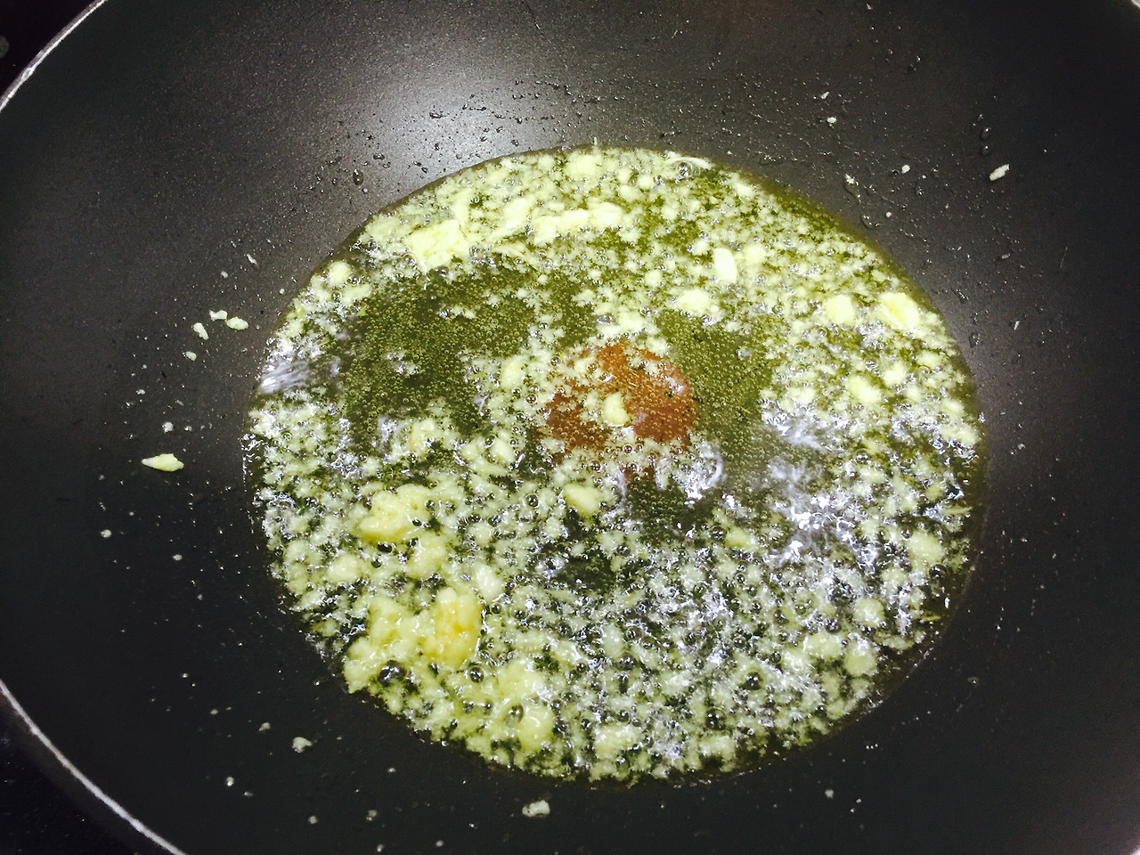 흥건한 올리브유에 다진 마늘을 자작하게 볶다가 누리끼리해질때 다른 재료도 다 넣고 볶는다.