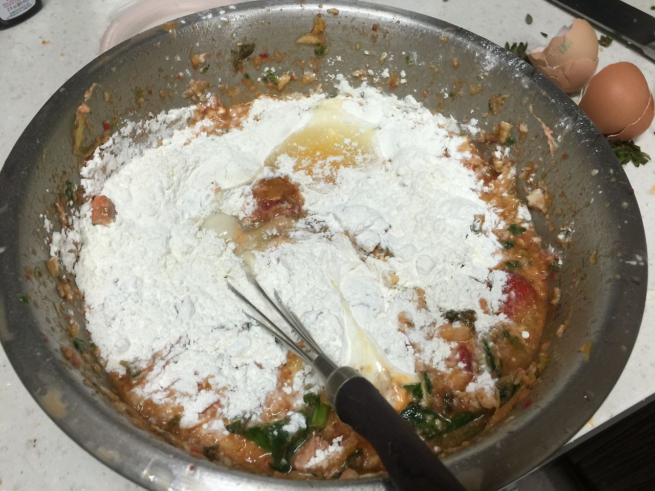 6. 물, 튀김가루, 부침가루, 계란을 넣고