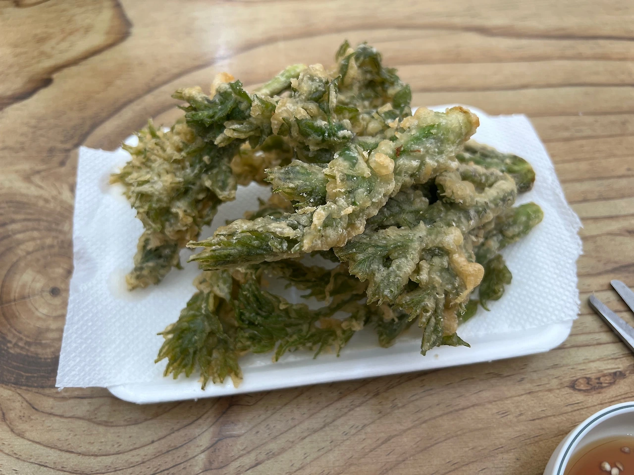 붕어빵을 한 입 베어물고 돌아서서는 두릅튀김 앞에서 한동안 고민을 했는데 그건 사실 점심을 먹고 온 탓이었고, 왜 시장에 오면서 밥을 먹고 온 것일까 하고 잠깐 후회를 했지만 오일장과 무관한 시장 앞 떡볶이집 간판을 보고 다음에는 밥을 먹고 오지 말아야겠구나 하는 생각을 더 많이 했다. 그러다 다시 현금서비스 받은 수수료와 이자를 생각 하며, 결국 두릅튀김을 먹기로 했다. 다음에는 저 집에서 떡볶이를 먹어야지 그 생각을 하며 포장마차 비닐 장막을 걷고 들어가 "저.. 제가 혼잔데 두릅튀김은 어떻게 해요?"라고 물으니 아랑곳 없이 돌아온 답이란 것이 "한접시에 만원"이었고 그 말에 쭈뼛거리는 걸 앙깔지게 쳐다보던 아주머니께서 "오천원 어치 줘?" 라고 되물어주셨는데 그 말이 황송하여 웃으며 "네!" 라고 씩씩하게 말하고 뒤이어 "먹다가 포장해가도 되나요?" 라고 신나서 물어봤고 "그건 알아서 하라"는 답이 돌아왔다. "아 네" 그리고 허허허 인지 헤헤헤 인지 하여간 그 사이 어디쯤에서 거짓 웃음으로 무안함을 달래고 들어와 앉아 두릅튀김을 받아들었고 두릅튀김은 고유한 두릅의 맛은 덜했으나, 아 두릅은 초장 맛이었나 싶었으며, 그래도 바삭한 두릅의 식감이 색달랐고 특히 곁들여주신 간장이 맛있었으며, 무엇보다 처음 온 티 팍팍 내는 혼자온 손님이 어색해보였는지 홀에서 서빙을 담당하는 아주머니의 살뜰한 보살핌 속이었는지 어쩐지, 조금씩 이 낯선 동네에 적응해가고 있는 느낌이 들었고 이상하게 안도감이 들었다. 나는 두릅튀김 반만 먹고 나머지는 아주머니께 싸달라고 하여 집에 와서 나머지 반을 저녁으로 먹었다. 아주머니가 비닐 두 겹으로 정성스럽게 싸주신 덕인지 두릅튀김은 저녁까지 바삭했다.