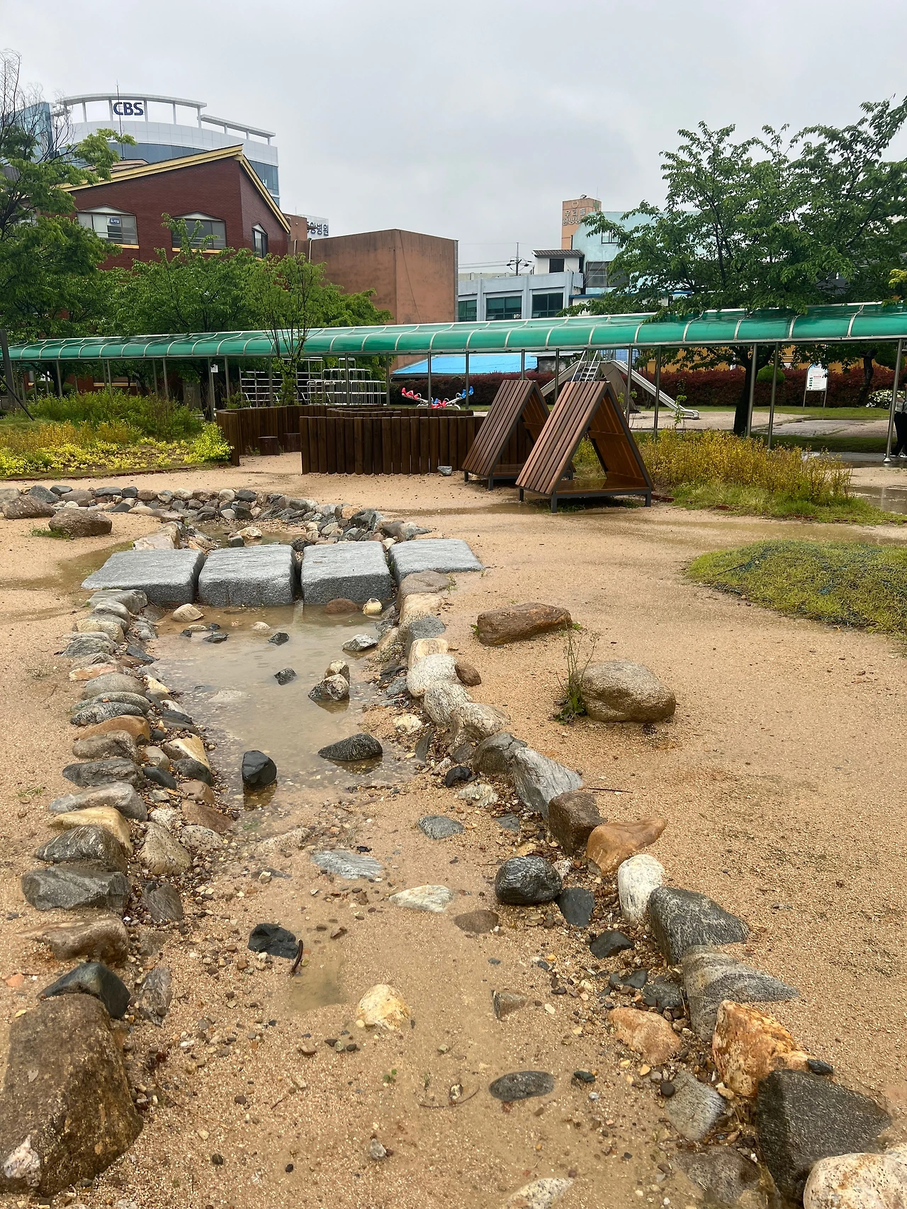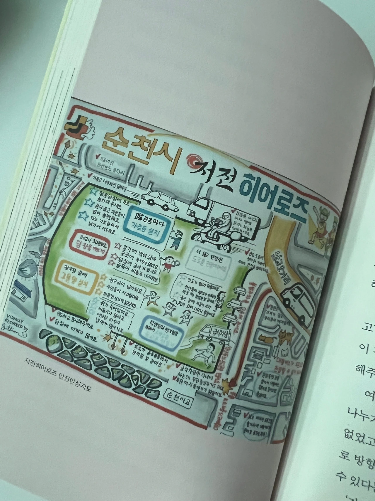 한편, 나는 그 밖에도 정원을 매개로한 도시재생사례를 재밌게 읽었다. 국가정원(순천만정원박람회의 장소) 조성 이후 마을마다 공공정원과 개인마당과 경계부에 공원을 조성하는 사업을 했다고 한다. 그리고 그 사업이 일단락 되고 최근 4~5년 동안 진행된 도시재생 사례에 대한 것이고, 이 책에는 그 중에서도 내가 머무르고 있는 저전동이란 마을의 도시재생 사례가 중점적으로 소개되어 있다. 동네 빈집을 개조해 마을호텔과 쉐어하우스로 개조하고 이를 마을의 사회적협동조합에서 관리 운영하는 것도 그렇지만, 나는 남초등학교 공간재구성 사례를 특히 흥미롭게 읽었다. (마을활동의 경험이 있는 나에겐 꼭 전설과도 같은 이야기, 그곳의 주요 주체는 저전히어로즈) 학생수가 급감해 비효율적으로 운영되는 운동장을 재구성한 것인데, 학부모와 학생은 물론이고 교육청, 주민자치회 등의 다양한 이해관계자들이 모여 함께 공간 구성을 하고 운동장을 반으로 나눠 한쪽을 생태놀이터로 바꾸었다. 무엇보다 학교 운동장 한가운데 모래로 언덕을 쌓고 그 위에 워터파크에나 있을 법한 미끄럼틀 하나를 설치한 것이 시각적으로 압권이었다. 본래 글로 볼 때 보다 실제 공간은 별 볼 일 없기 마련인데, 전문가와 함께 공간감까지 고민한 것 같았다. 단연 압도적! 인접한 성당 관계자를 2년간 설득해 복잡한 통학로를 정비하며 한전(도로 정비와 CCTV 설치)의 도움까지 받았다고 한다. 그리고, 동선과 공간 구분을 위한 수단으로 정원이 활용되었다.