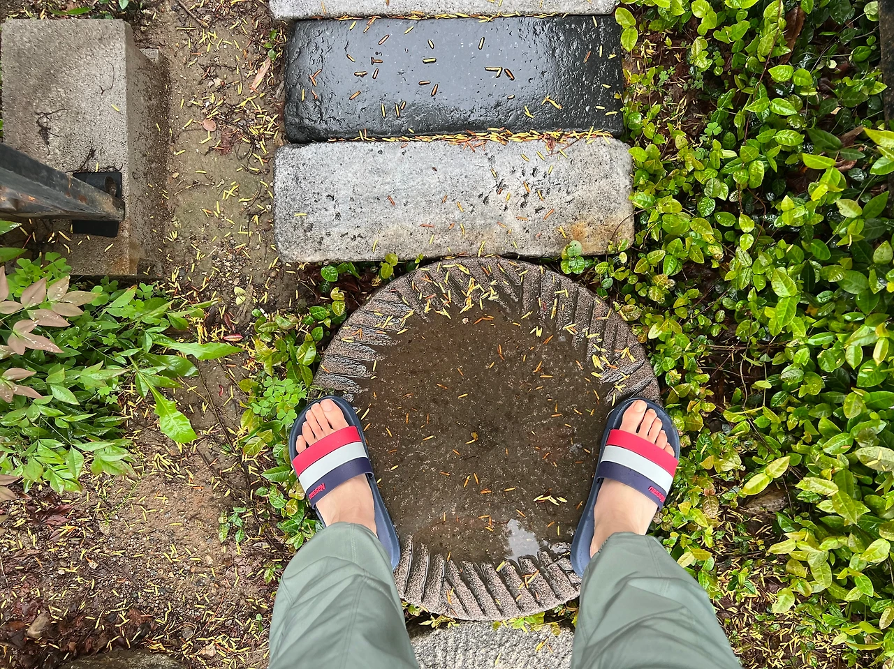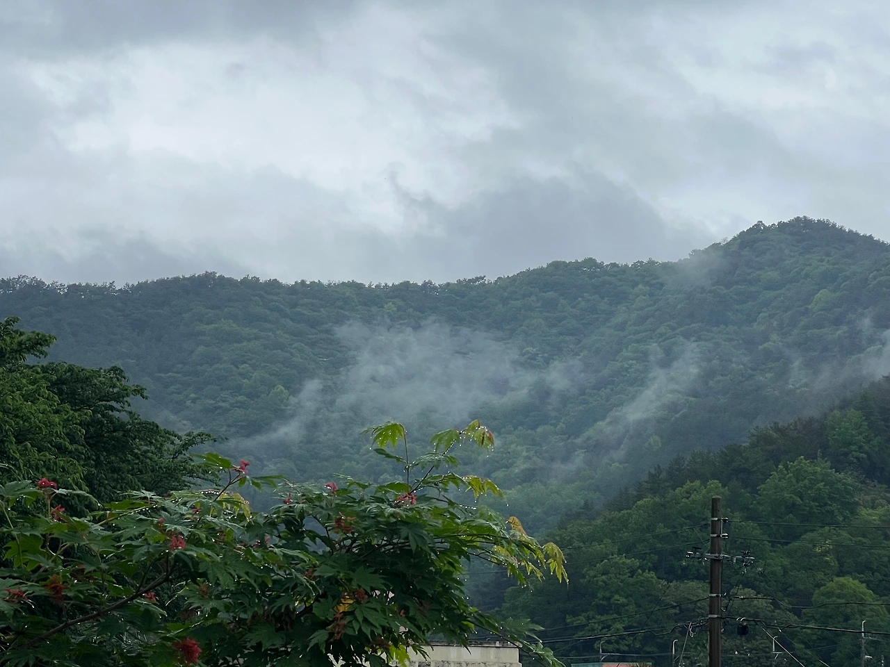 빗 속 별 수 없이 시내를 걷다가 우산을 들어 물이 똑똑 떨어지는 살 끝을 올려다보면 낮은 지붕위로 하늘 이라기 보다 탁한 구름 아래 짙은 녹색의 산이 운무를 뿜어대며 어디선가 불쑥 산신령이 튀어나올 것 같은 진귀한 풍경에 맥없이 멈춰서 좌우를 둘러보던 시간과.