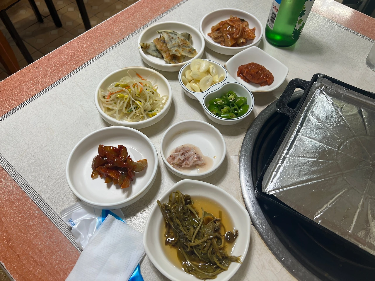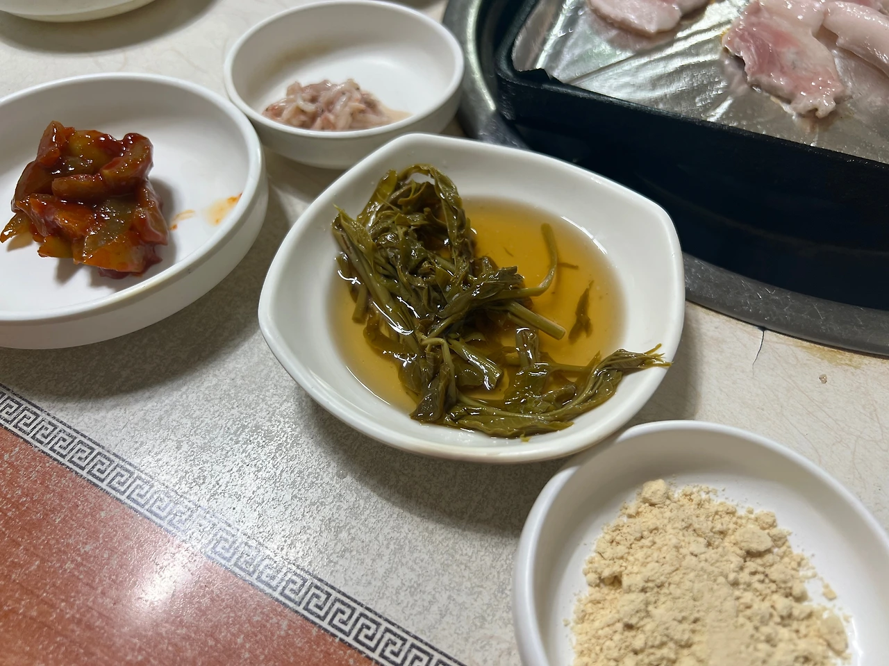 어제는 간만에 날이 맑았고 오늘은 아침부터 또다시 비가 내리는 중이다. 그야말로 주룩주룩. 순천 2일차였던 어제는 내려오고 처음으로 남편과 함께 점심시간을 보내는 날이었고, 원래는 제보 받은 제피열무김치가 나온다는 생선구이집을 갈 예정이었으나 날이 맑다는 이유(?), 남편의 변덕에 따라 점심부터 고기를 궈먹는 것으로 방향을 바꾸고 순천역 뒤 일본가옥풍의 철도 관사들이 모여있다는 관사마을에서 생삼겹살 구이를 먹었다. 어디서나 맛볼 수 있는 삼겹살구이가 평타 이상이기 어렵다지만 고기를 좋아하시는 분들 말이 두께가 적당해서, 냉동이 아니어서 확실히 고기맛이 남다르다고 하여 찾아간 곳으로, 고기맛을 잘 모르는 나는 사실 그 곁들임 반찬과 함께 먹어 더 좋았던 곳이다. 겯들임반찬으로는 가죽짱아치와 매실짱아치, 콩가루, 새우젓, 직접 재배하신 것 같은 상추 등이 나왔다. 그러고보니 사진도 메인요리는 없고 맨 곁들임음식 뿐이다. 여긴 어딜가나 반찬이 너무 좋기 때문이다.