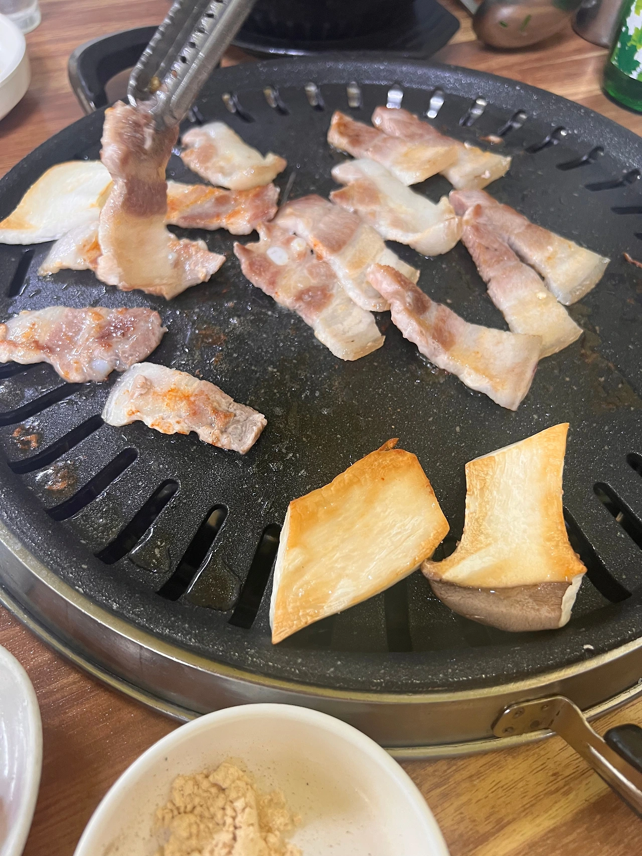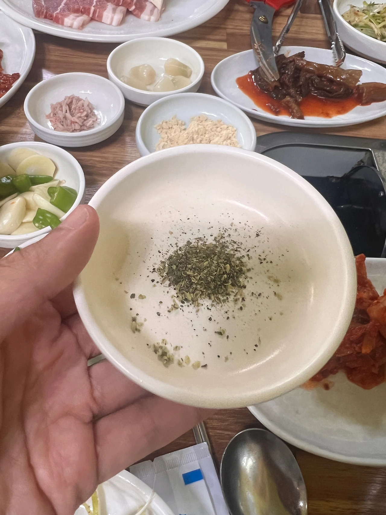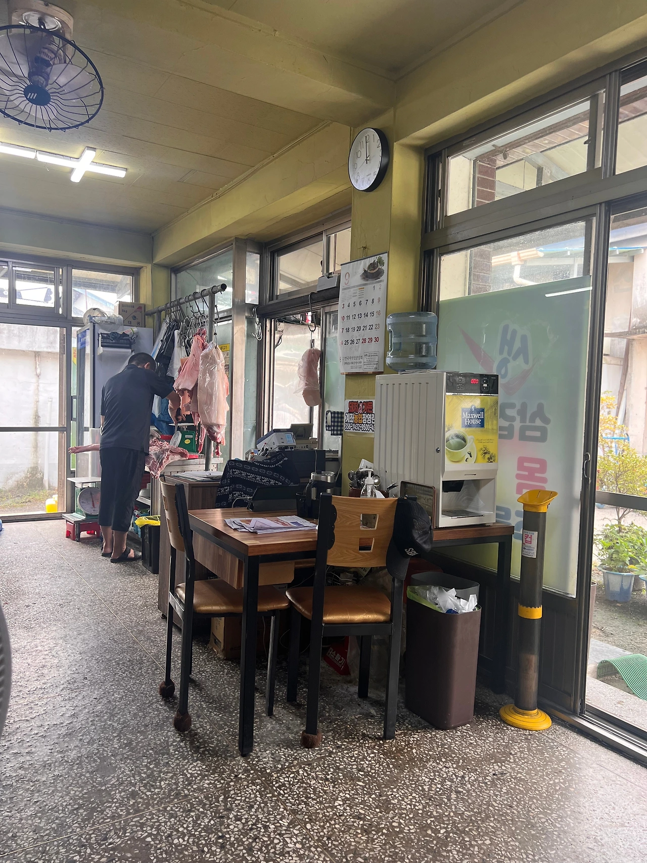 우리는 남편이 지역분에게 소개받은 다른 정육식당에 갔고, 다른 곳보다 알려지지 않아서인지 다른 국밥집에 비하여 식당내부는 한산했다. 그곳은(다른 곳을 안가봐 모르겠지만) 꼭 숙성한 회를 그 자리에서 잘라 내주는 것처럼 바로바로 썰어주시는 식당이었다. 우리는 삼겹살 2인분과 순대국밥 하나를 시켜 나눠먹었고 이곳의 특이점이라면 국밥에 잼피를 넣어먹을 수 있다는 점이었다. 왜인지 가공되지 않은 잼피가루를 본 것 같았고 레몬그라스처럼 향긋한 향이 났다. 삼겹살은 정형해 냉장보관된지 얼마 안된 것인지 색이 평소 보던 것보다 더 붉고, 조직이 단단한 느낌이었다.