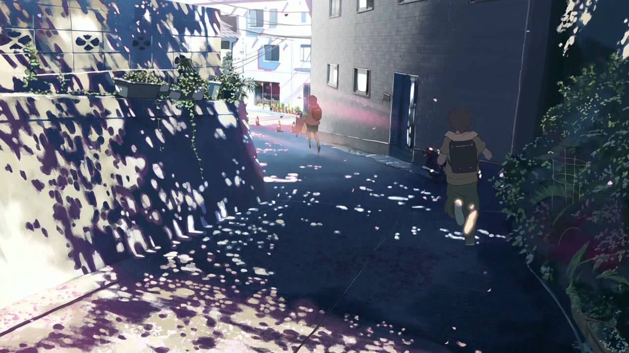 우리가 경험을 제하고 배경에서 얻는 건 일종의 이미지다. <초속 5cm>의 오프닝 장면을 예로 들어보자. 영화가 시작하고 물웅덩이에 떨어진 벚꽃이 보인다. 골목에 세워진 오토바이와 자전거가 보인다. 자동차도 있고, 자동차가 세워진 언덕길도 보인다. 두 사람이 언덕 위에서 아래로 내려간다. 두 사람은 전철 건널목 앞에서 멈춘다. 여자아이가 건널목 바깥쪽에 서 있고, 전철이 지나간다. 이후 여자아이의 행적은 이사를 하였으리라고 추측될 뿐이다.