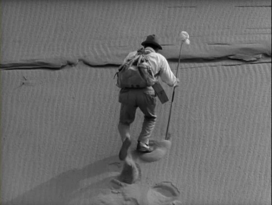 작열하는 태양 아래에 뜨거운 모래가 넘실대는 이 영화의 주요한 이미지를 보면 이것이 영화라고는 생각이 들지 않는다. 그런데 그 위에서 허둥대는 어느 남자의 모습이 화면 위에 올라올 때, 우리는 비로소 이것이 허구의 세상에서 진행되는 허구의 인물임을 깨닫게 된다. 말하자면 이 영화의 배경은 매우 사실적으로 묘사되어서 이곳이 현실이라고 믿게 되는데 정작 그 위의 인물들에게는 허구의 표지가 부여된다. 그러므로 우리는 이 영상을 마치 사진 위에 투영되는 영사기의 그것처럼 받아들이게 된다. 즉 배경과 인물이 따로 논다는 소리다.
