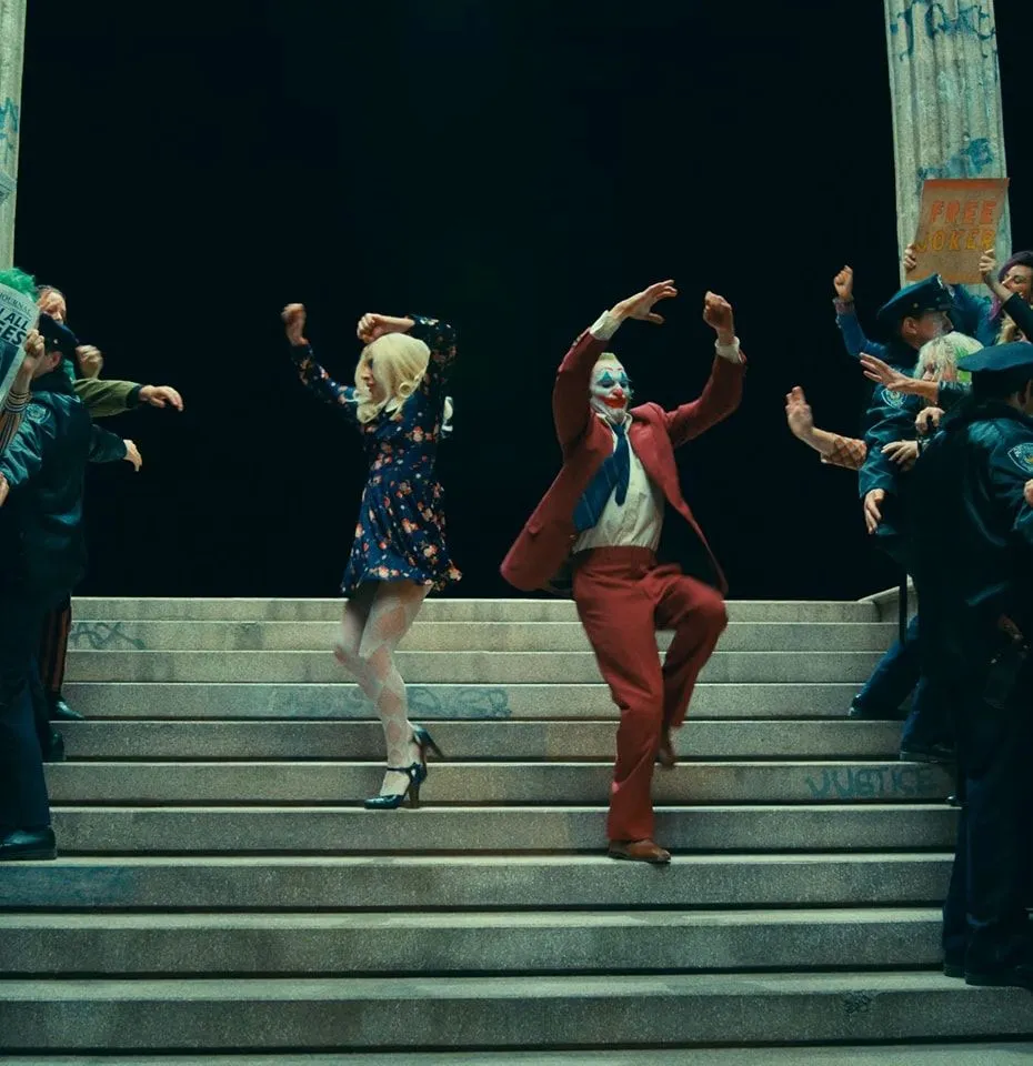 영화의 부제인 폴리 아 되(Folie à Deux)는 공유 정신병을 뜻한다. 이 제목은 아서의 ‘조커’가 사회 전체의 망상으로 번지는 모습을 지적하기도 하지만, 보다 근본적인 사실 하나를 지목한다. 공유 정신병은 두 사람이 서로 가까운 관계에 있어야 한다는 전제가 있고 이를 따라 서로를 분리하는 게 일차적인 해결책이다. 그렇지만 고담시의 언론은 아서 플렉의 범죄를 두고서 “사회 복지 시스템의 오인이라던가 부적절하고 현실에 조응하지 못하는 정책”과 같이 표현한다. 이는 1편의 도입부가 보여주듯 사회 시스템이 제대로 굴러가지 않는 고담시에서 아서 플렉의 유년기가 얼마나 불우했는지를 상기시킨다. 방임 가정으로 돌려보내진 ‘고아’ 아서 플렉과 고담시가 시스템으로 얽혔다는 점을 보여주면서, 둘 사이에 공유 정신병 관계를 성립시킨다. 보통은 아서 플렉의 정신병이 고담에 옮았다고 생각하지만, 반대일 수도 있다는 것이다. 고담을 너무나 사랑했던 아서가 고담과의 공유 정신병 관계에 들어섰다고 가정해보자. 군중이 ‘조커’에 열광한 건 이 환상이 고담시가 축구해온 결과로 여겼기 때문이다. 한 사회가 쌓아올린 병폐가 빠른 속도로 무너지는 것은 ‘조커’ 아서 플렉이 계단을 내려오는 리듬만큼이나 경쾌하다. 1편에서 영화는 올라가는 것은 고되고, 내려오는 것은 흥겹다는 쉬운 비유법을 사용했다. 그러나 단순히 아서가 자기 삶을 놓아버린 일이 아니라 한 사회가 정신의 ‘상태’를 공유하고 있음을 고려하면, 부모를 잃은 것은 아서만이 아니다.