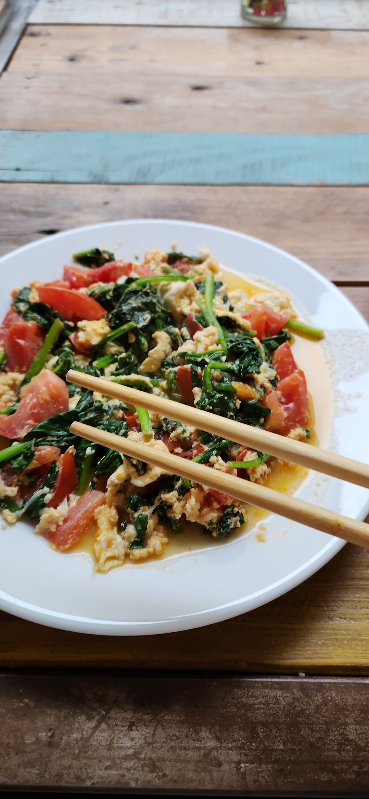 뭐 토마토계란은 실패하기가 힘들다. 가스렌지를 켜고 올리브유에 빠르게 볶아 순식간에 완성! 마침 부엌에는 쉽게 보기 힘든 젓가락도 있다. 와인 한잔에 토마토시금치계란볶음을 젓가락으로 집어먹으니 꿀맛이다. 심지어 건강에도 좋은 느낌이잖아?