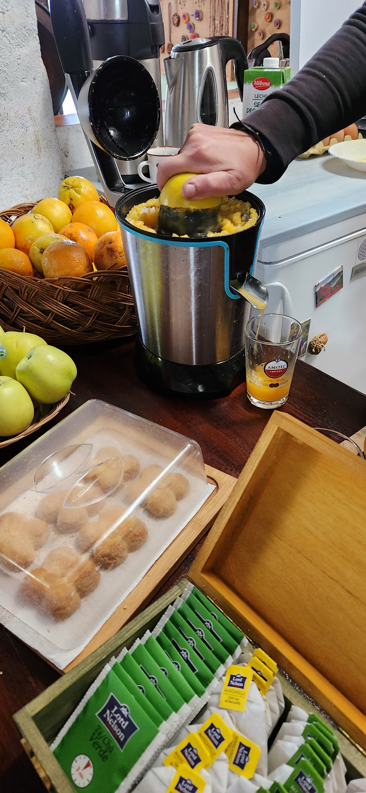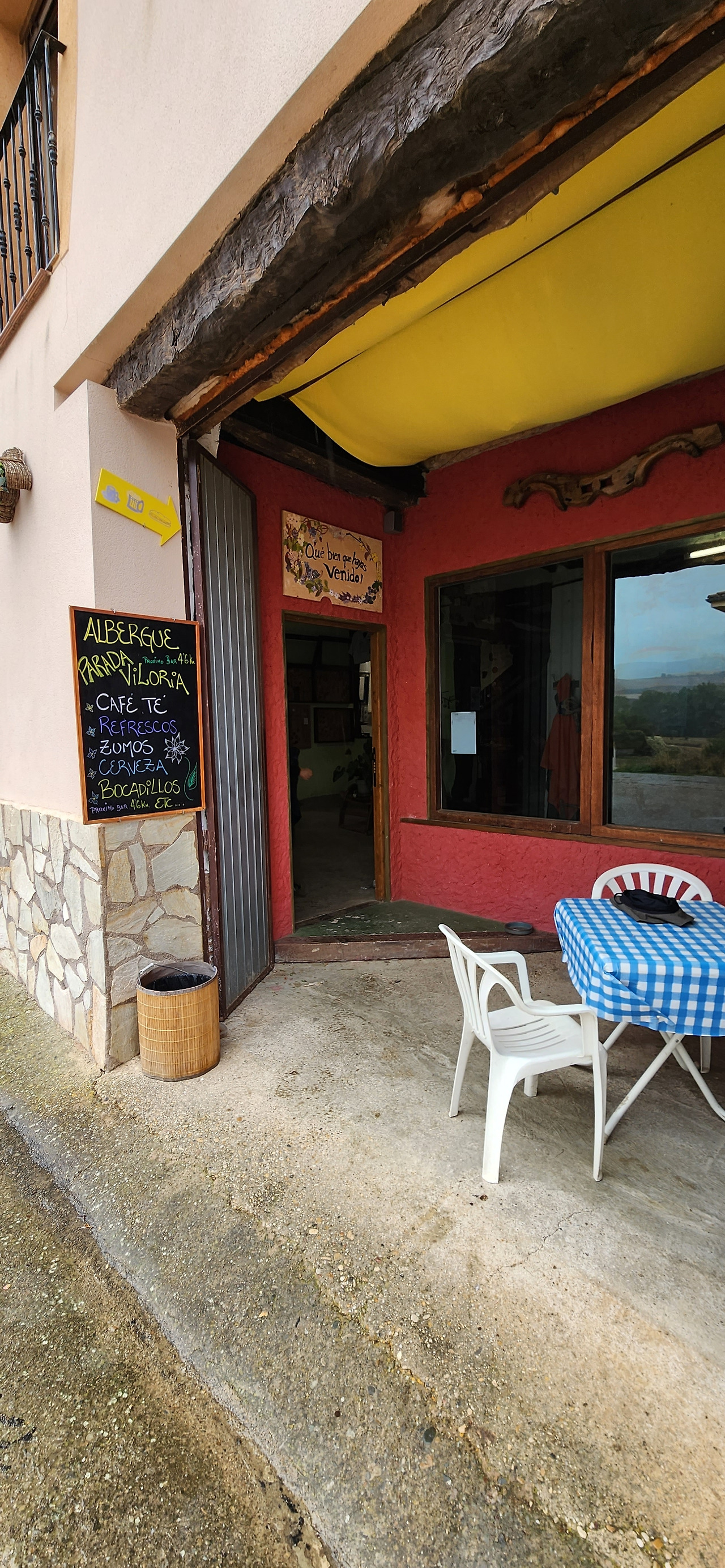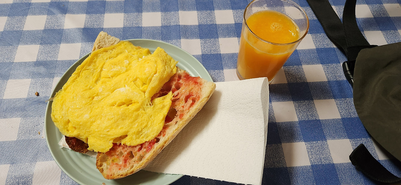 오늘 여정 도중에 만난 가게는 알베르게도 운영하며 1층에서는 도네이션으로 바를 운영하는 작은 곳이었는데 음악도 좋고 아늑한 오두막 산장같은 기분이랄까. 느낌있고 오믈렛도 부드럽고 오렌지쥬스도 즉석에서 짜서 만들어주시고 고양이도 있고 좋았다.
