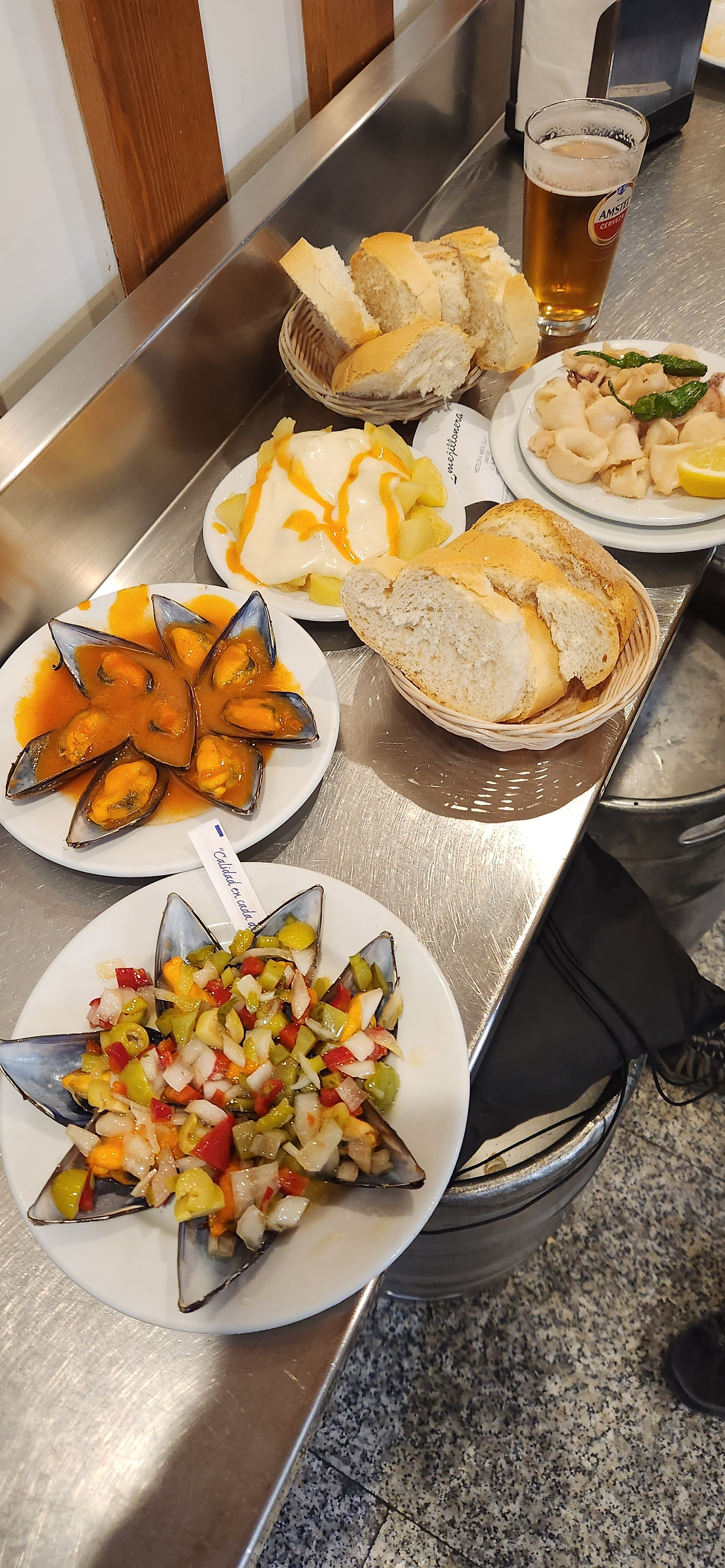하지만 뭐니뭐니해도 여기서의 베스트는 둘째날 먹은 바로 요 홍합 타파스. 몇가지 종류의 홍합 타파스를 판다. 대표 메뉴인지 카운터에 사진으로 크게 붙어있는 빨강 홍합, 야채 홍합 타파스를 한접시씩 시켰다. (물론 그 외 다른 것들도 시켰다) 홍합을 손으로 잡고 쏙 빨아먹으니 나름 즐겁다. 특히 빨간양념 홍합은 대단히 한국적인 맛이 난다. 뭐라고 해야할까 아주 라이트한 해물찜이랄까 떡볶이소스 느낌? 이거 예상치 못했는데 갑자기 살짝 고향의 맛이 심금을 울리네.