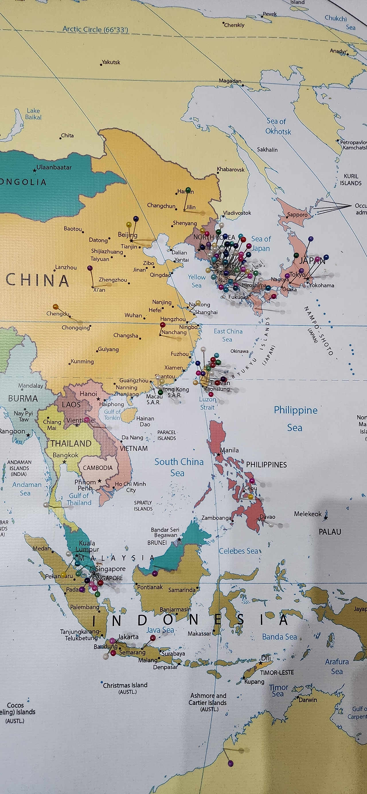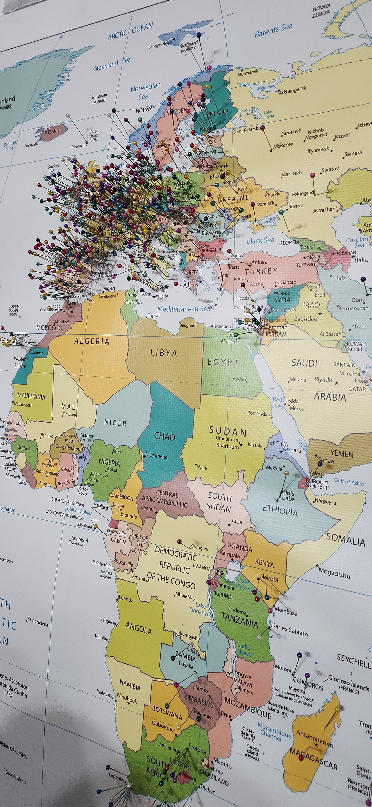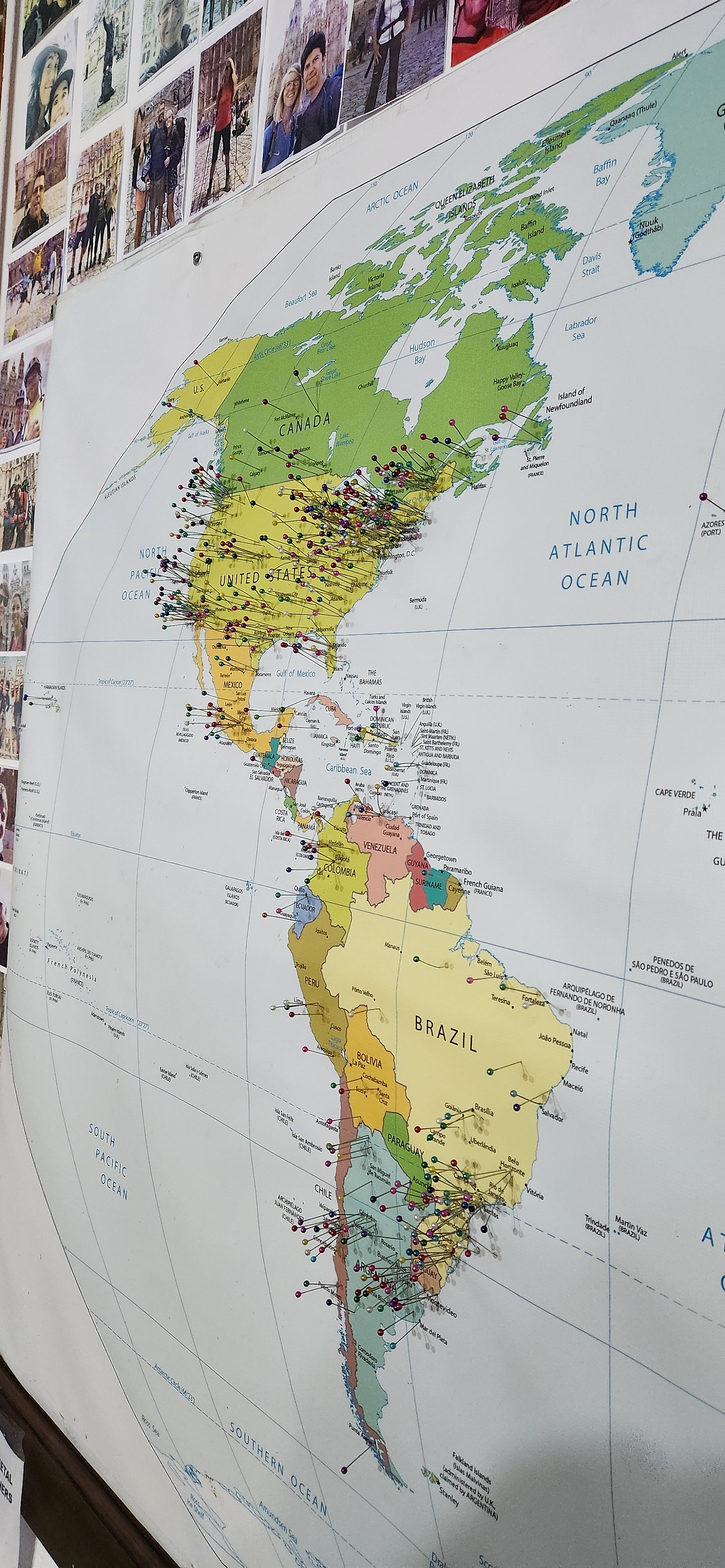 식당 한켠에는 지도가 몇장 있었는데 각자 자기가 온 곳을 핀으로 표시하는 용도의 지도였다. 당연히 본국 스페인과 가까운 서유럽쪽이 핀이 가장 많고 미국도 많다. 아시아에서는 역시나 단연 한국만 빼곡하다. 알고 있었지만 이렇게 지도로도 확인하니 또 신기하구만.