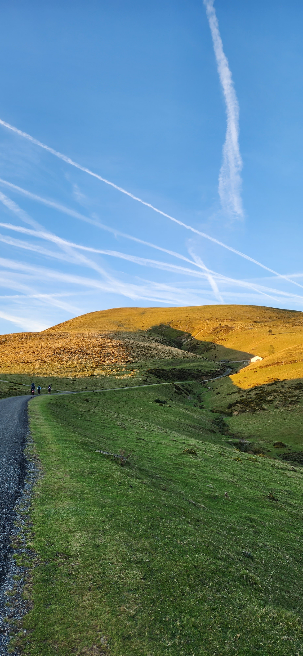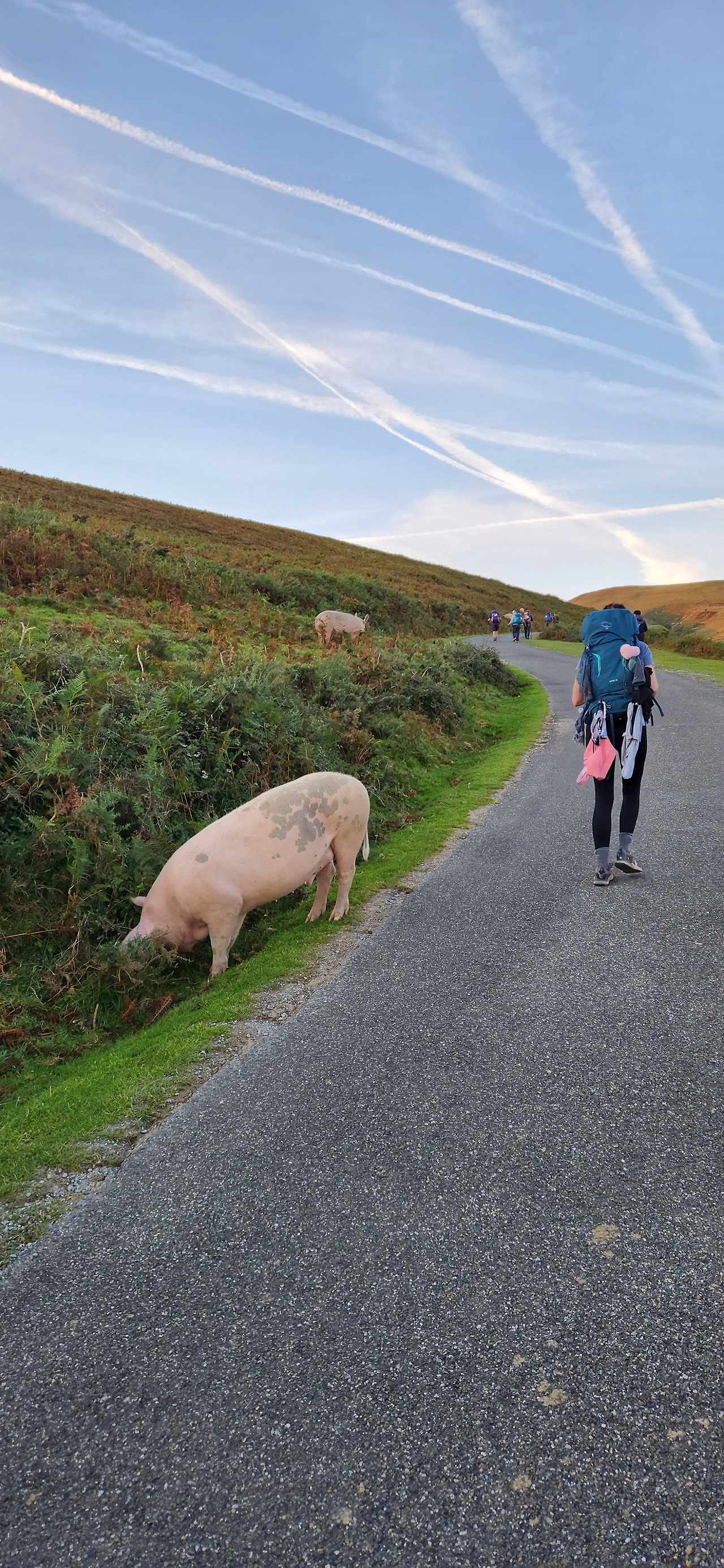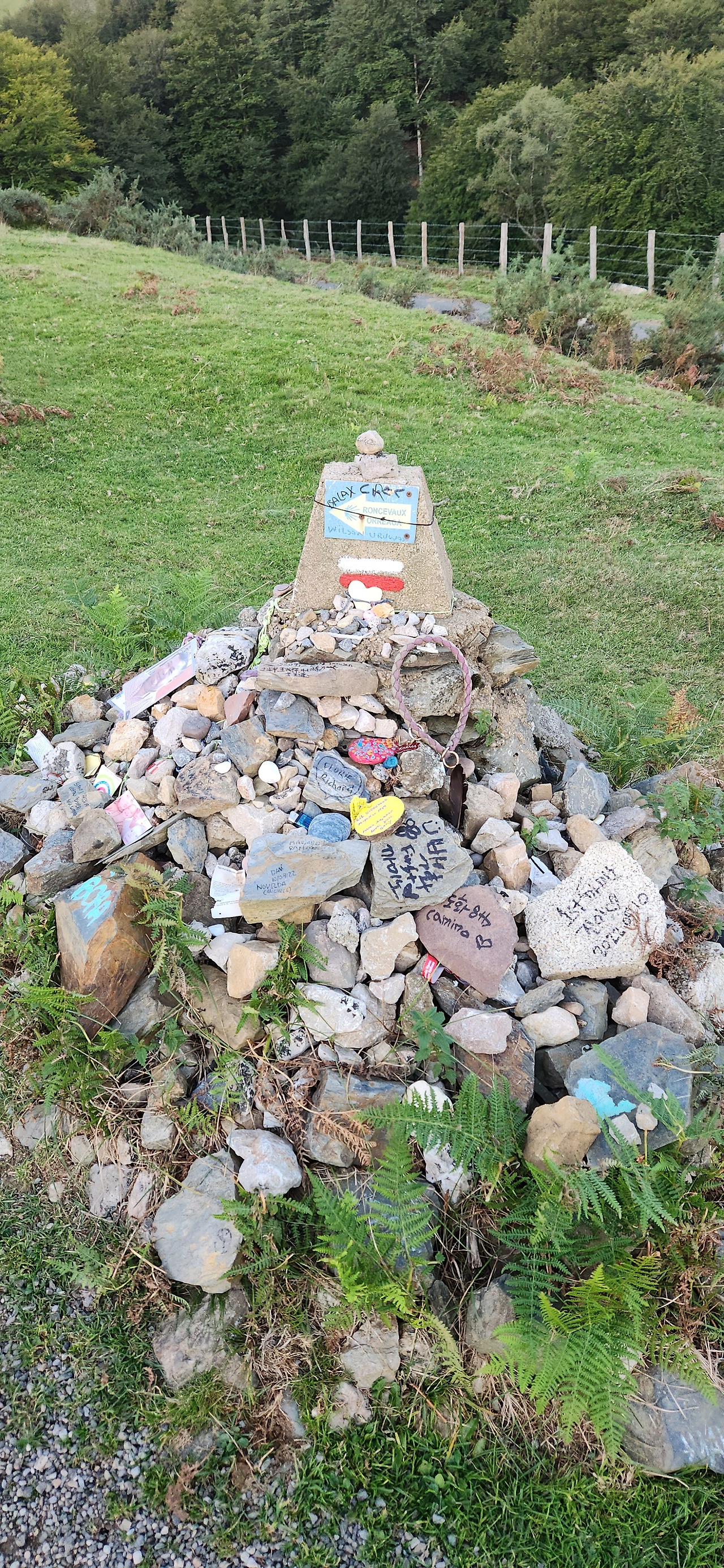 가는 길 내내 양떼며 소, 말, 돼지 등 여러 동물들을 쉽게 마주쳤다. 피레네 산맥에서는 방목을 많이 하는 모양이다. 한없이 고요한 가운데 동물들이 달고있는 방울소리가 고즈넉하게 들리니 뭐라 말할수 없는 평화로운 기분이 들었다. 전체적으로 오르막이라고는 하지만 완만하게 계속 오르는 언덕에 가까워서 오늘의 길은 꼭 순례길이 아니더라도 하이킹 코스로만으로도 굉장히 즐겁고 아름다웠다. 부모님께 보여드리고 싶네. 꼭 걷지 않더라도 산 꼭대기의 국경 넘는쪽 빼고는 대부분 차도와 같이 있어서 차로도 쉽게 올라올 수 있고, 실제로 풍경보러 오는 차들도 많이 있었다.