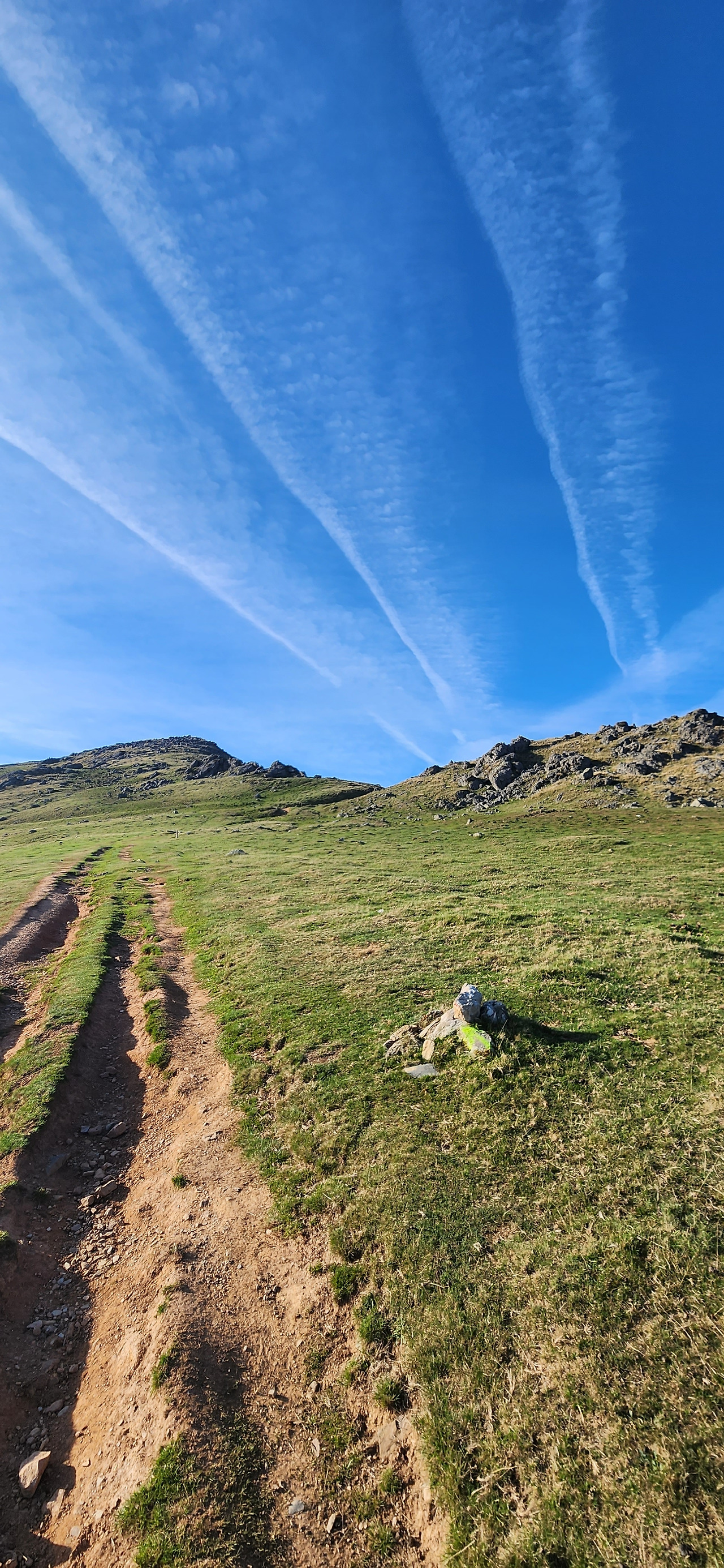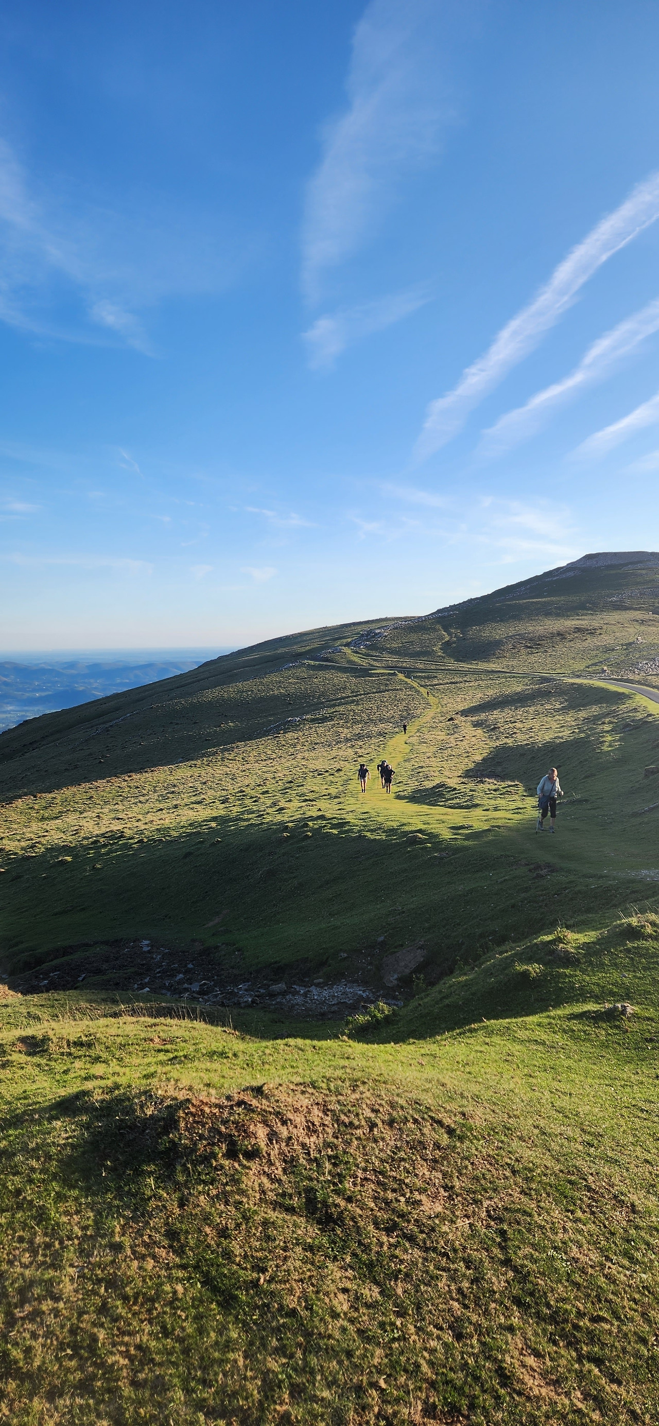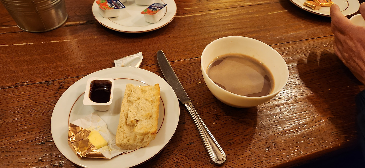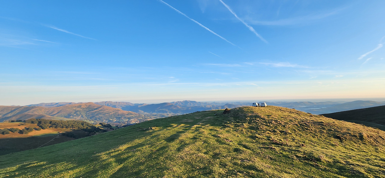 아침으로 나온 사발에 담긴 뜨끈한 커피를 마시고, 동키로 짐을 보내고 가벼운 작은 가방과 마음으로 출발한다. 날씨마저 거의 완벽해서 가을의 시원하고도 청량한 바람에 멋진 피레네산맥의 풍경을 원없이 보면서 걸을수 있었다. 이정도의 넓고 멀게 펼쳐진 풍경을 보는건 전에 중국여행에서 타공 이후로 처음이지 않을까 싶다. 다른게 있다면 타공은 끝없이 펼쳐진 드넓은 초원에 가까웠다면, 여기는 높은곳에서 내려다보는 산의 풍경인데 봉우리들이 뾰족하지 않고 둥글둥글하여 시야가 굉장히 넓게 펼쳐진다.