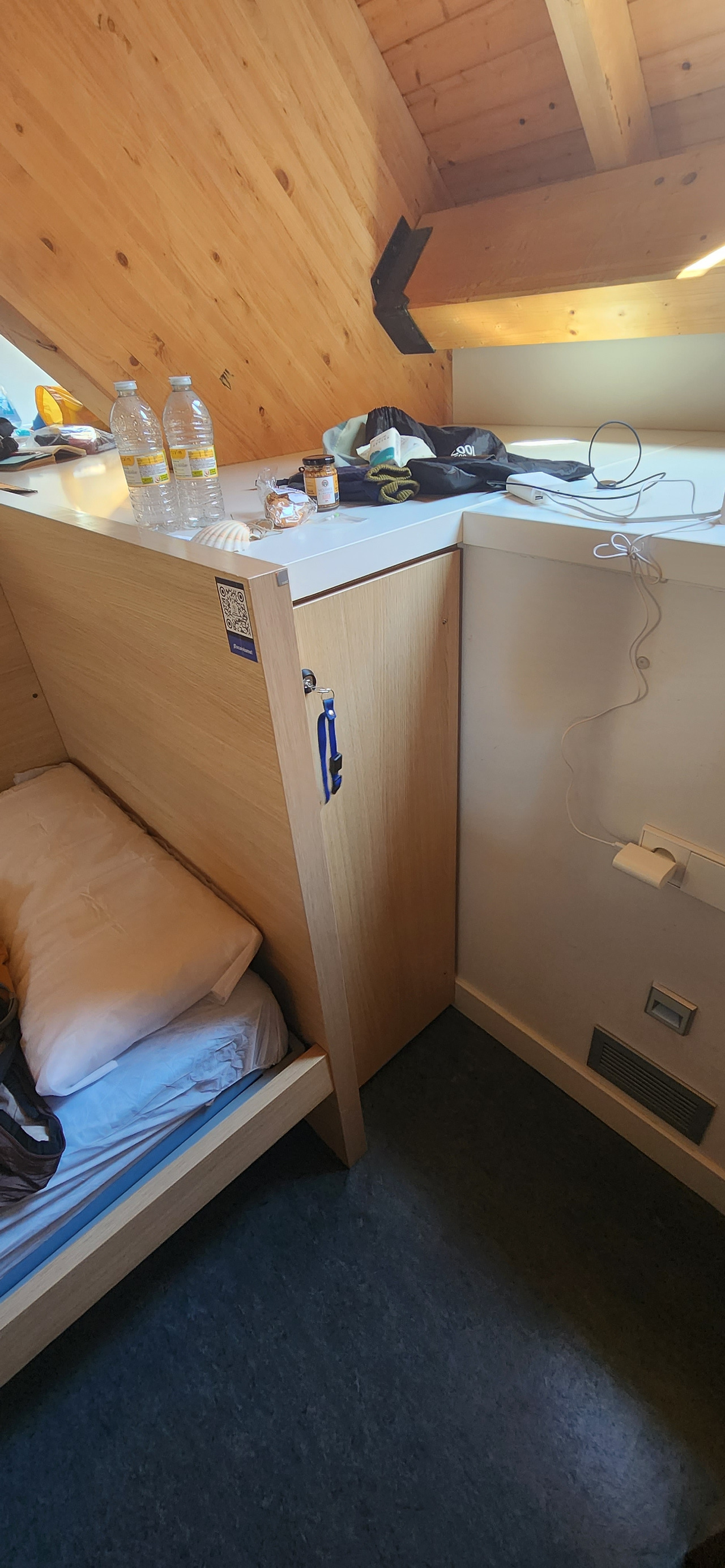 론세스바예스의 하나뿐인 알베르게는 오기 전에는 시설도 열악하고 도난도 종종 일어난다고 긴장하면서 왔는데, 막상 와보니 코로나 시국에 리뉴얼을 했는지 통나무집 비슷한 느낌의 완전 깨끗하고 아늑한 최첨단(?) 설비를 자랑하는 곳이었다. 무려 터치로 작동하는 엘베에다가 칸막이 있는 침대, 게다가 1유로로 쓸 수 있는 (잠글때 쓰이고 열면 반환된다) 사물함까지 있는데 완전 갬동. 트레비엥 그라시아스!