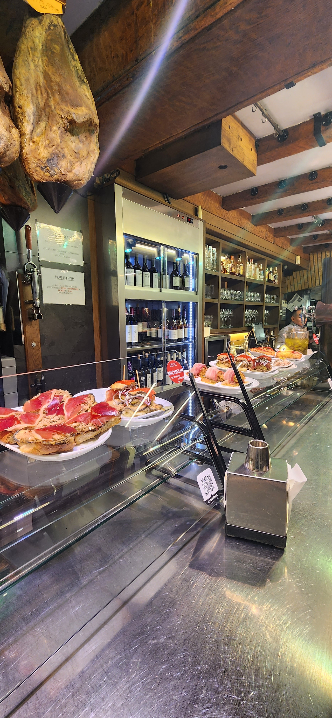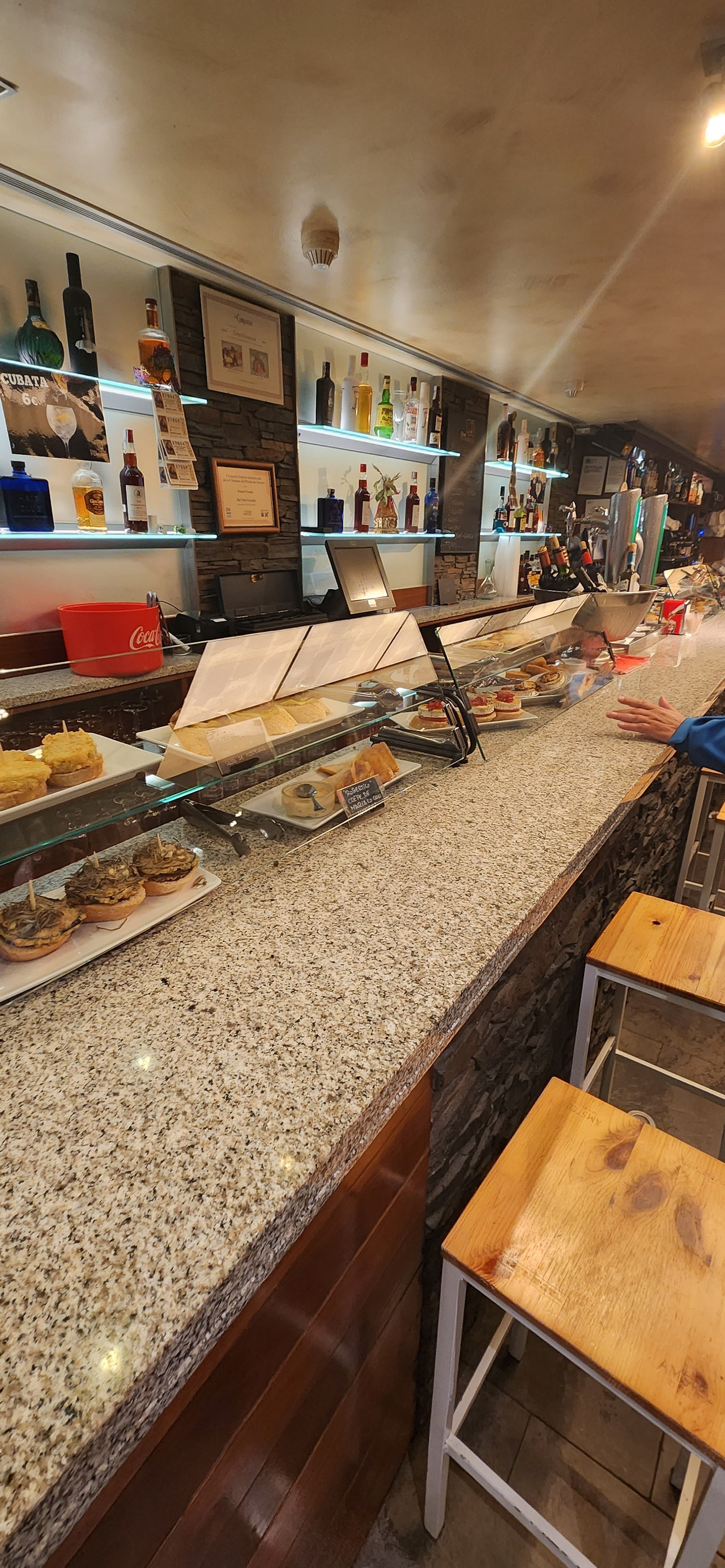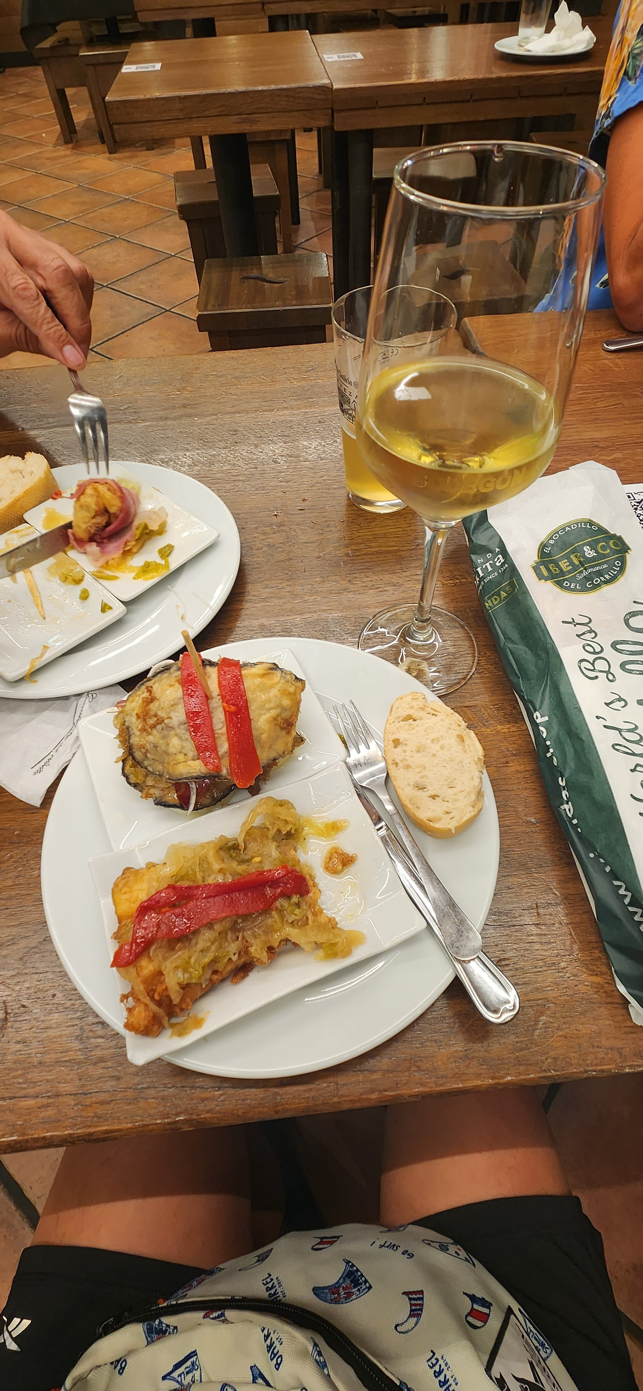우리나라에서 술자리를 1차 2차 하듯이 핀초스 바도 한군데서 계속 있지 않고 여러군데를 옮겨다니며 먹는다. 가게마다 다른 메뉴와 분위기를 즐기는 맛이 있다. 나도 동행한 외국인 친구 (라기보다 형님누님들이지만) 들과 두어군데 다니면서 살짝 맛보았다. 요즘엔 우리나라서도 워낙 글로벌한 음식이 많아서 대부분 그리 낯설지는 않은 맛이다. 술한잔 + 안주2개정도가 대략 10유로가 채 안나오는데, 간단하게 가성비가 참 괜찮은 기분이다.