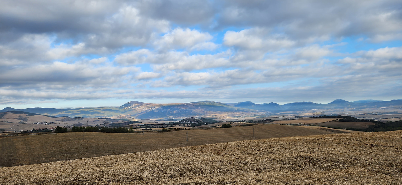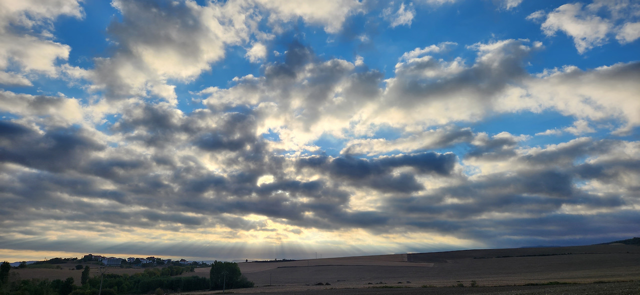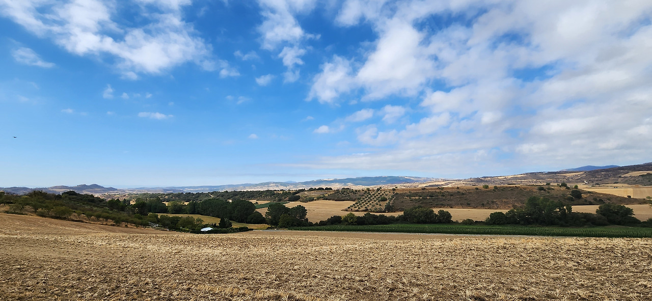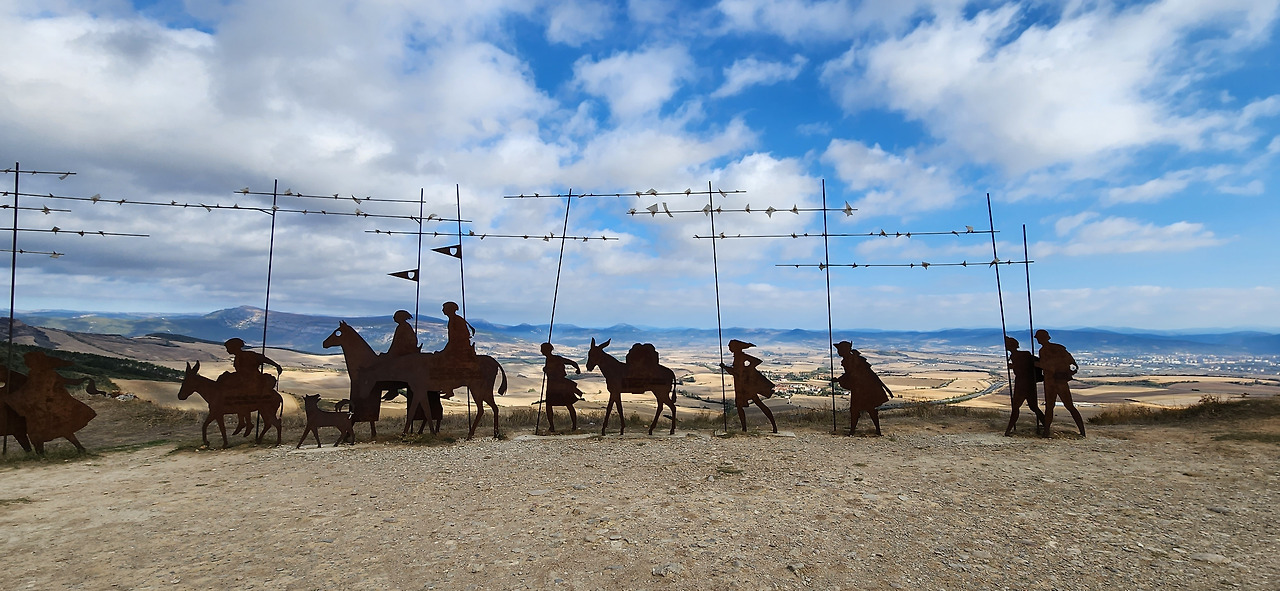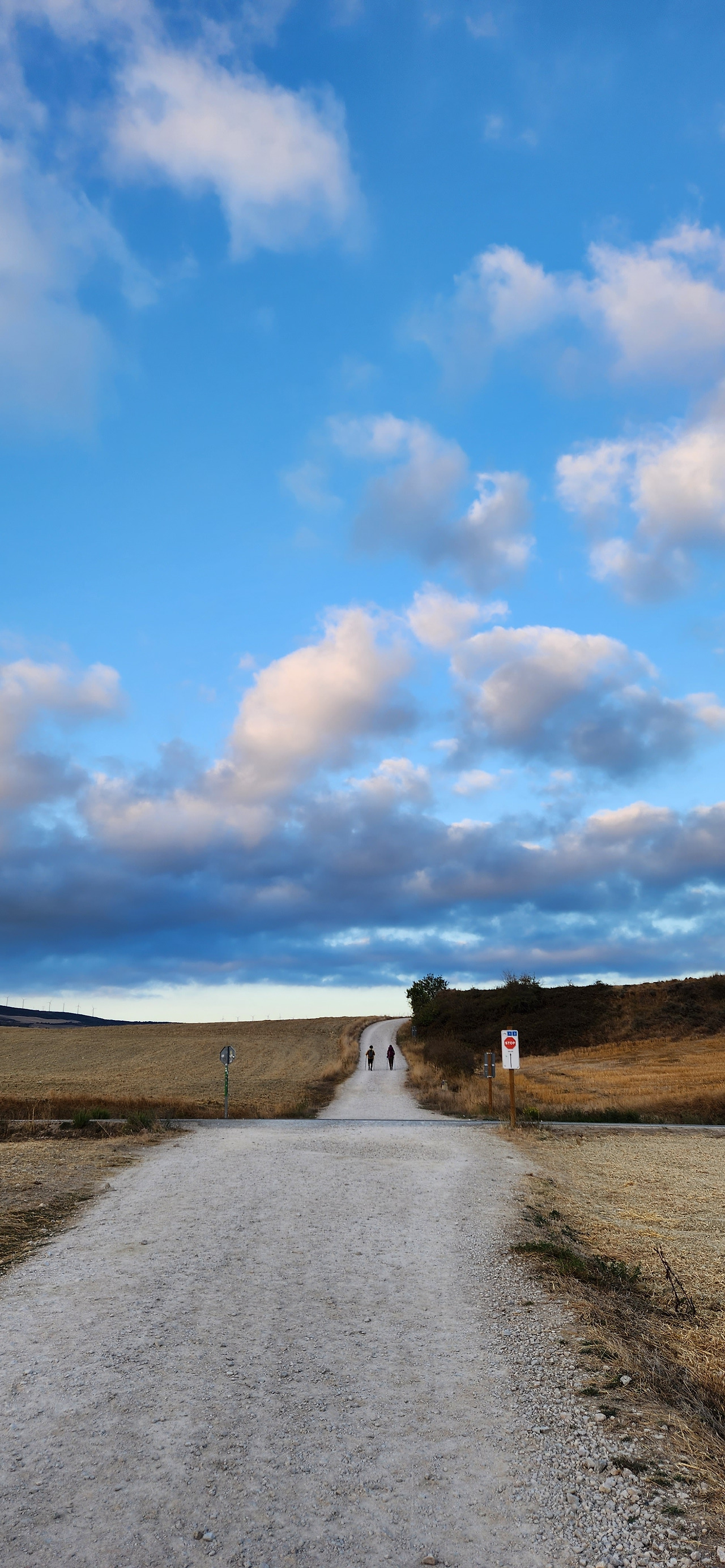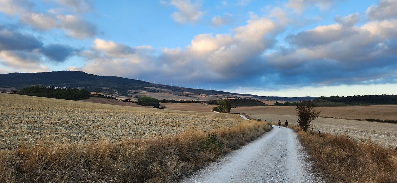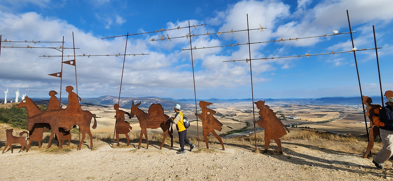 오늘의 여정은 푸엔테라레이나까지 약 24킬로의 길. 아마도 순례길에서 가장 유명한 장소일 용서의 언덕을 지나는 날이다. 도심을 빠져나오기까지 한시간여는 지루한 외곽의 길이지만, 이윽고 저 멀리 언덕이 보이면서 천천히 오르는 평원길이 시작되었다. 서울에서는 볼 수 없는 지평선과 수평선상의 아침햇살. 저 멀리 보이는 언덕의 지형을 상상할 수 있는 평원의 길이다. 아침의 청명한 날씨와 함께 동이 트면서 비현실적일듯 아름다운 풍경이 펼쳐졌다.