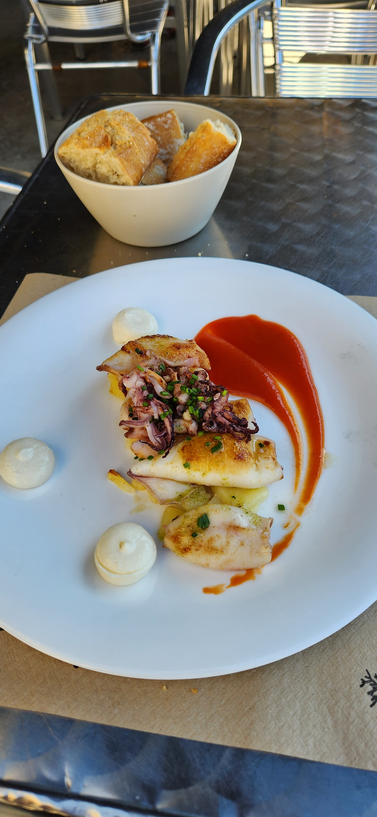 땡볕의 마을을 조금 둘러보다가 구글맵의 평점도 괜찮고 한적해보이는 식당을 찾아 들어갔다. 영어 메뉴판은 없었지만 글자를 얼추 유추한다든지 사진번역앱을 쓰면 대강 무슨 메뉴인지는 알 수 있다. 세트 메뉴로 1코스는 일종의 야채수프, 2코스는 오징어, 그리고 후식은 샤베트를 주문했다. 음 나름 선택도 잘 했고 맛있네.