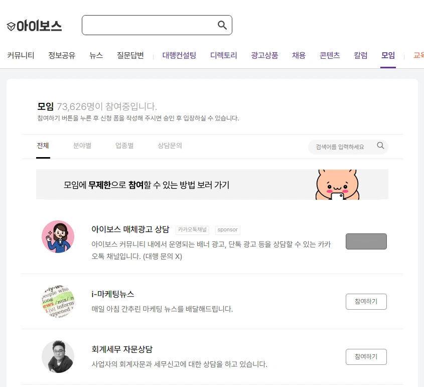 '아이보스'라는 커뮤니티를 이용하고 있는데 마케팅, 콘텐츠 분야에 관심 있는 사람들이 있는 단톡방이다. 이런 단톡방의 장점은 회사 관리자가 들어가 있는 단톡방이기 때문에 좀 더 체계적으로 운영되고 다른 단톡방과 비교했을 때 상대적으로 이상한 사람이 덜하다는 장점이 있어서 좋다.