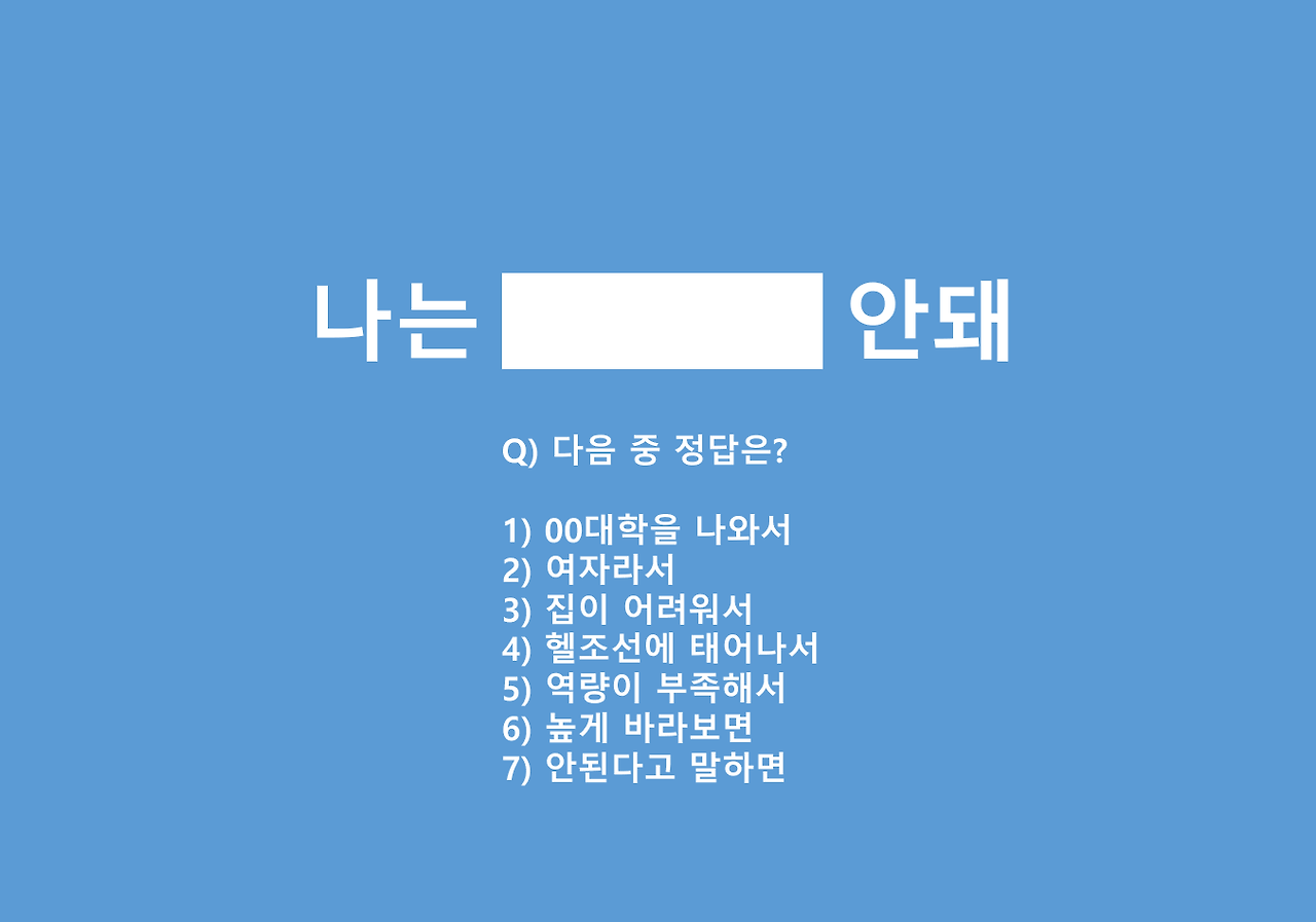 나는 SKY라 아니라 안돼,여자라서 안돼,인턴 경험이 부족해서 안돼,헬조선이라 안돼,여하튼 나는 안돼