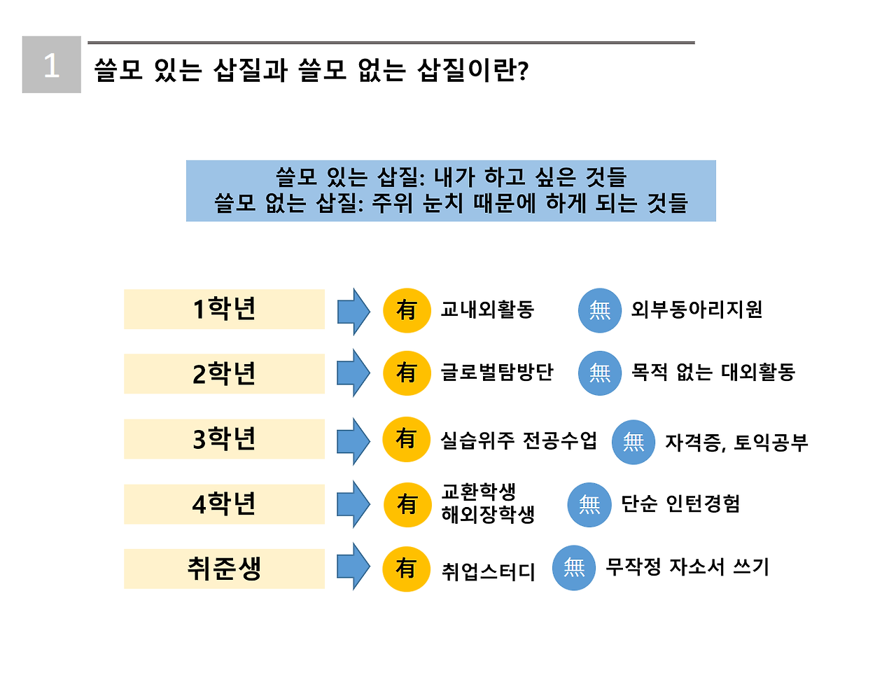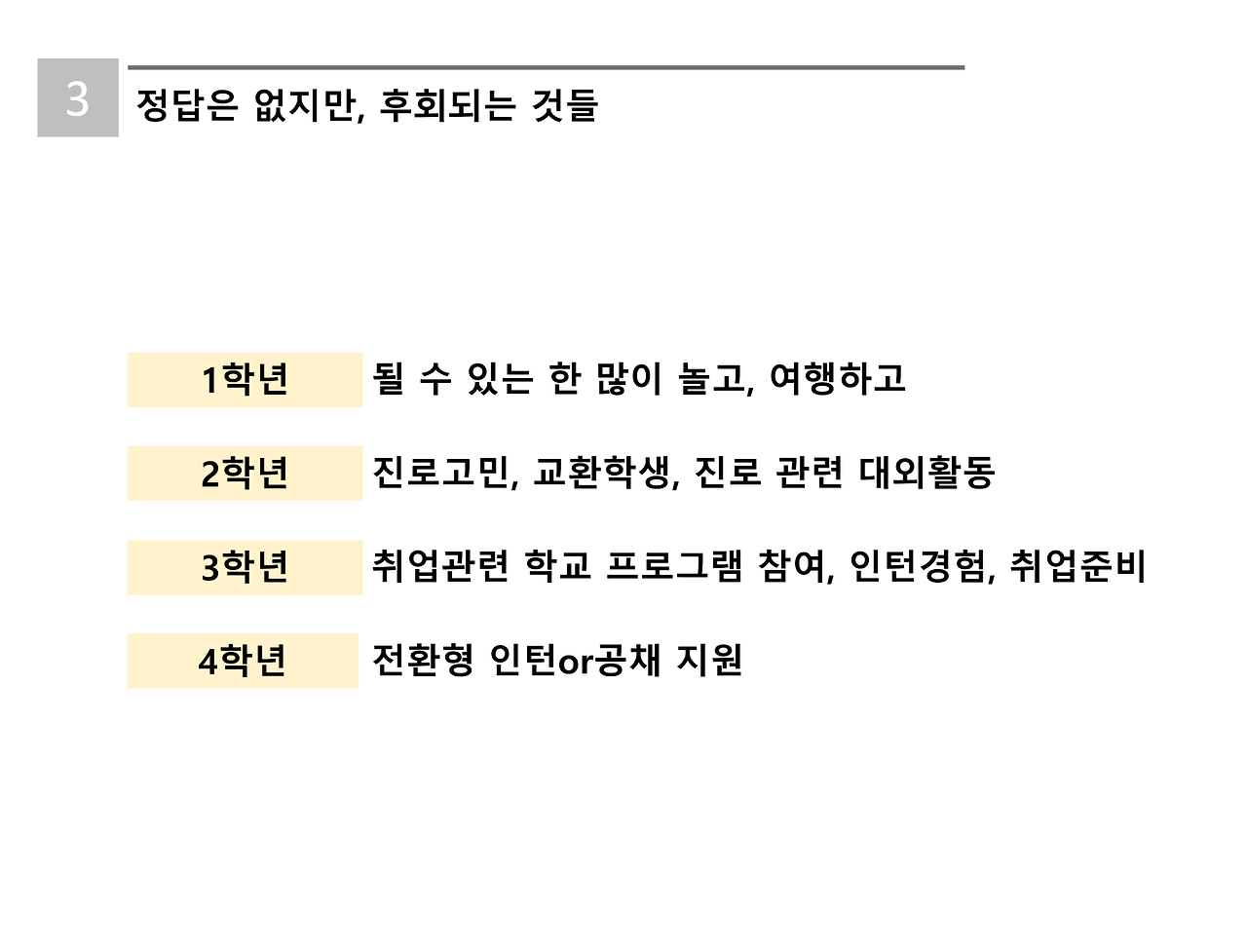 대학생 때 무엇을 하면 되고, 안 하면 되는 지를.