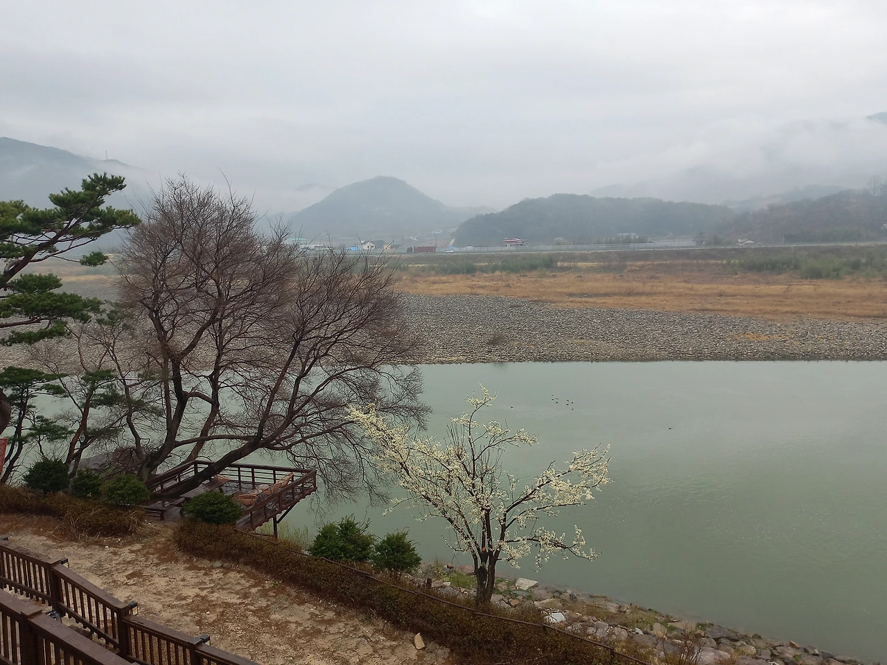 강은 회색이 섞인 초록이 되었고 그 강에서 오리들은 꽤 많이 놀고 있습니다.
