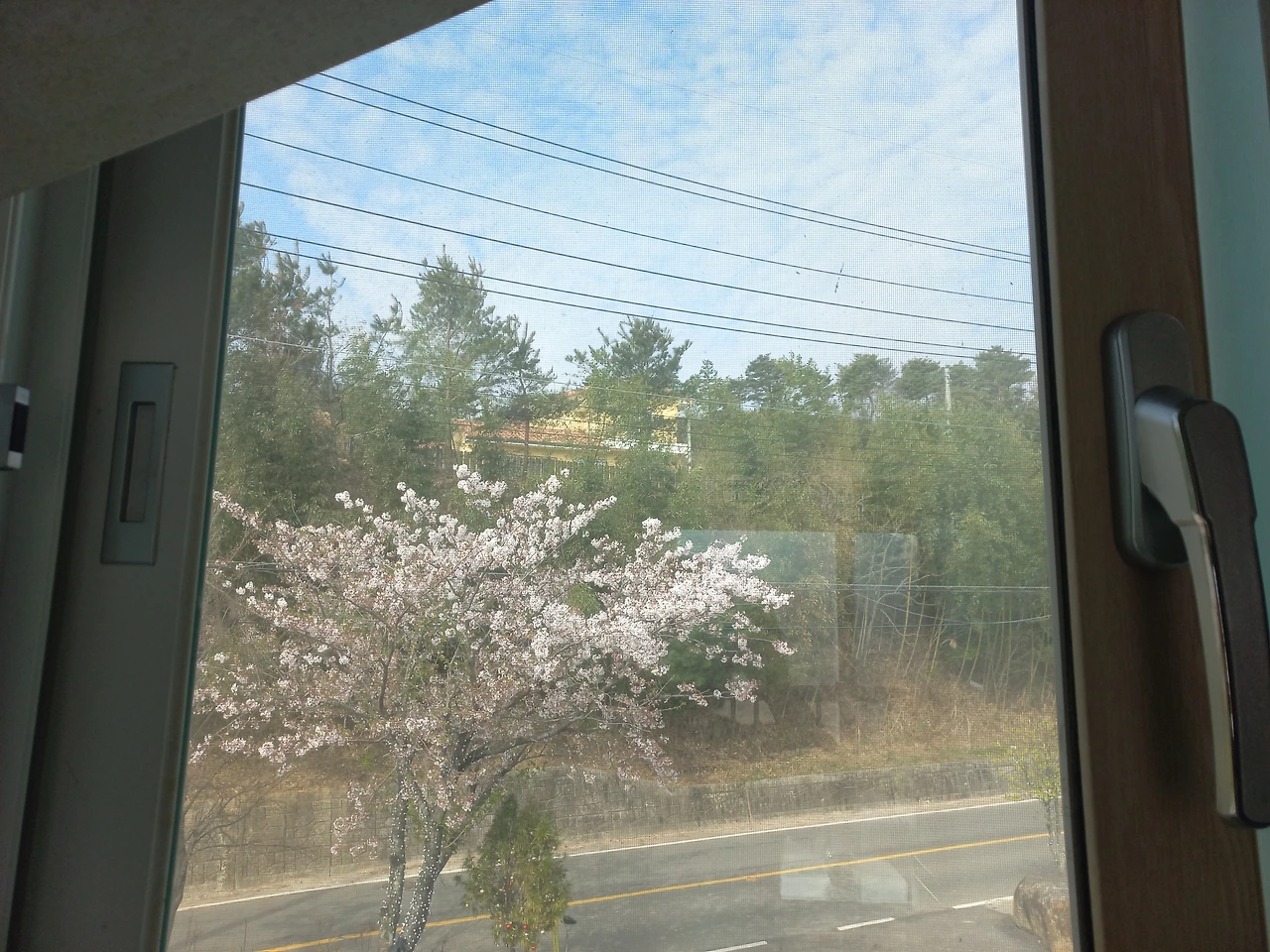 주방 화구 앞에 있는 창문을 환기 때문에 엽니다. 창문을 열면 나무가 있는데 오늘에서야 벚꽃나무라는 것을 인지했습니다. 그냥 환기용으로 열기만 하고 마당이 있고 도로만 있다고 생각했습니다.