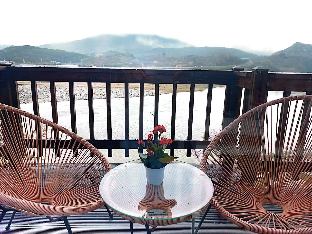 창 바로 앞에는 강이 보입니다. 강 너머 산도 있습니다.