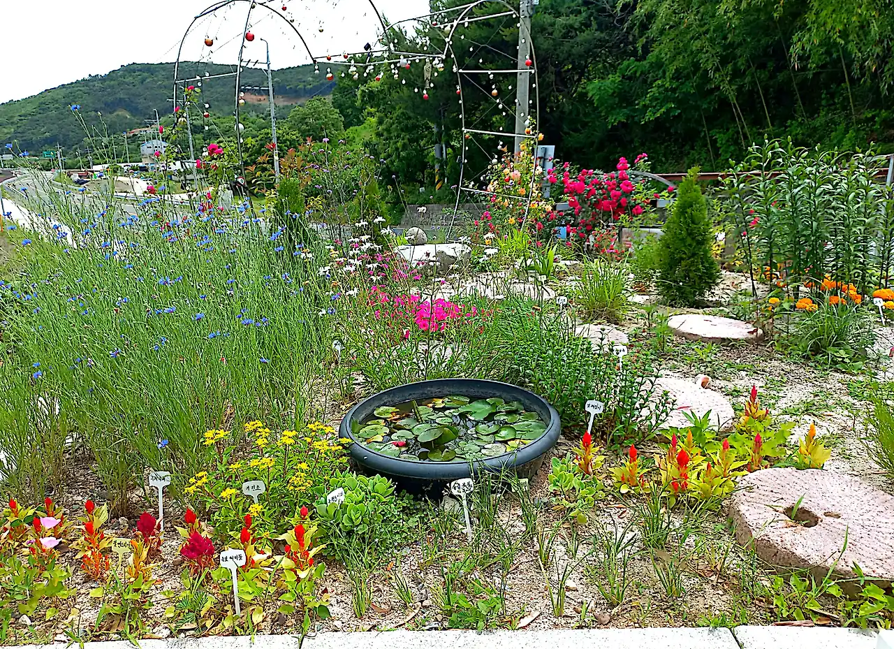 수레국화, 낮달맞이, 수련. 닭벼슬패랭이, 매발톱, 백합, 데이지, 마편초, 바늘꽃 등등
