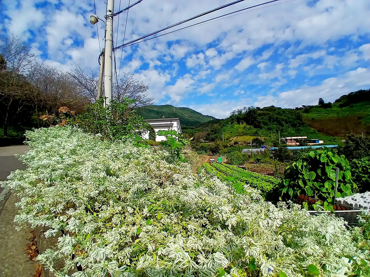 마당한쪽에는 정원이 있고 뒷마당에서 강으로 내려가는 길 한쪽에는 고구마가 심어져 있습니다.