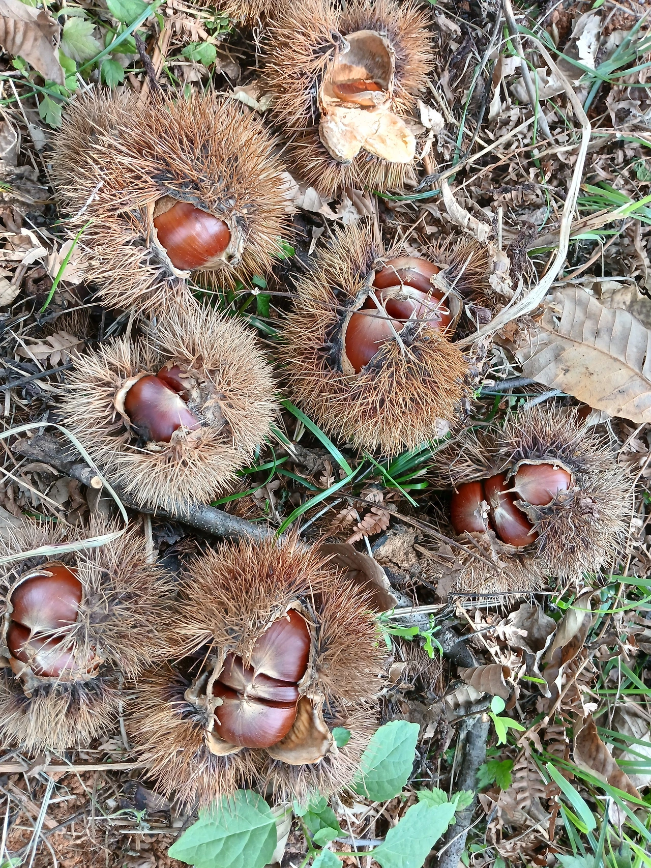 밤송이가 땅에 많이 떨어져 있는데 빈껍데기와 알이 찬 밤송이가 골고루 섞여 있습니다.